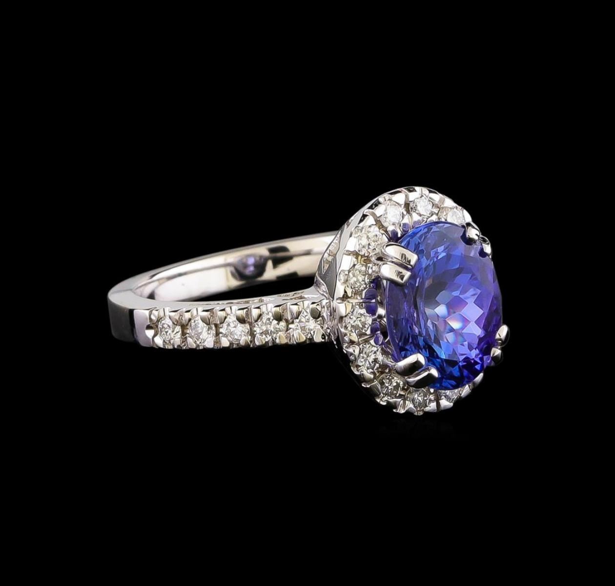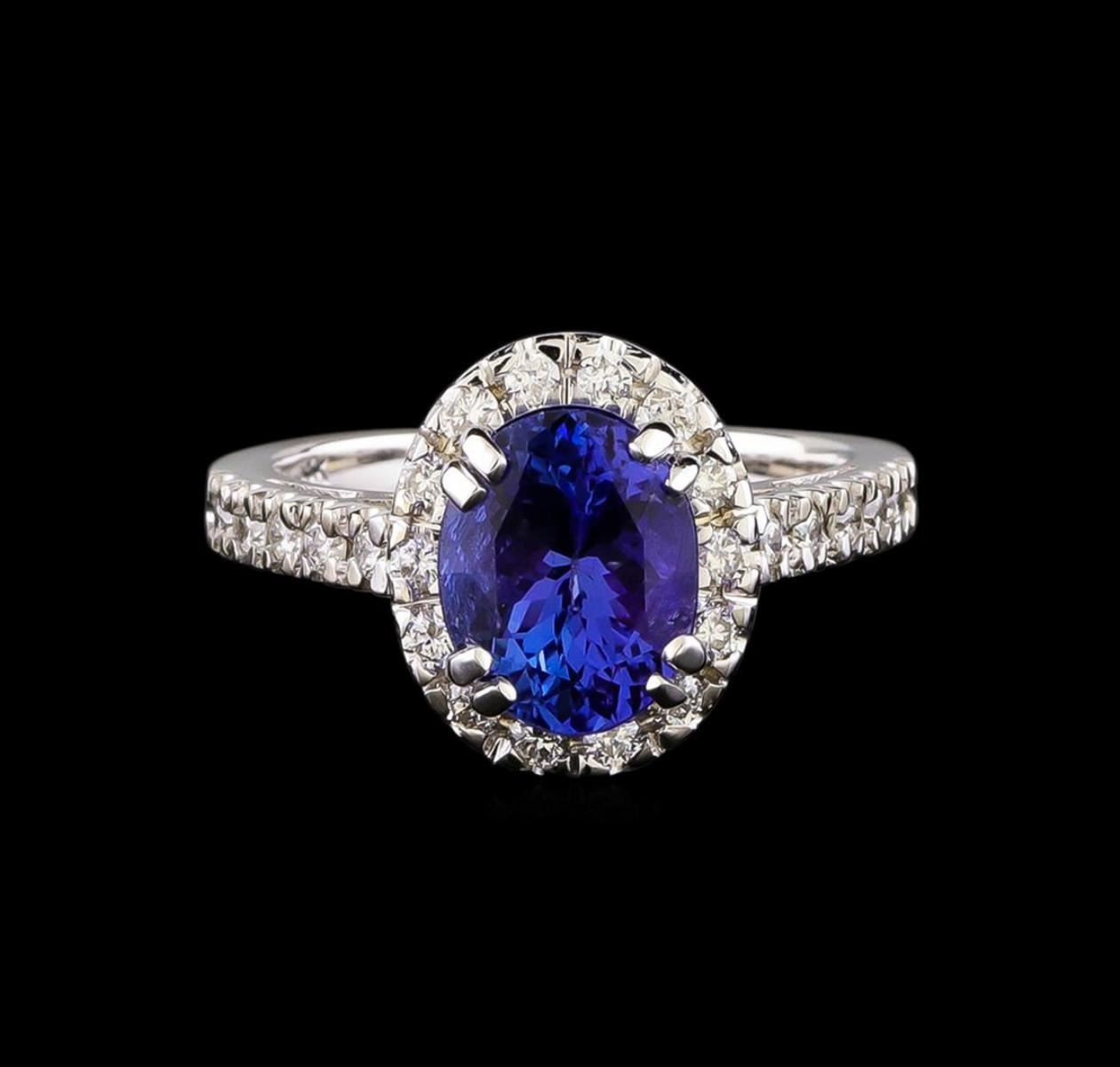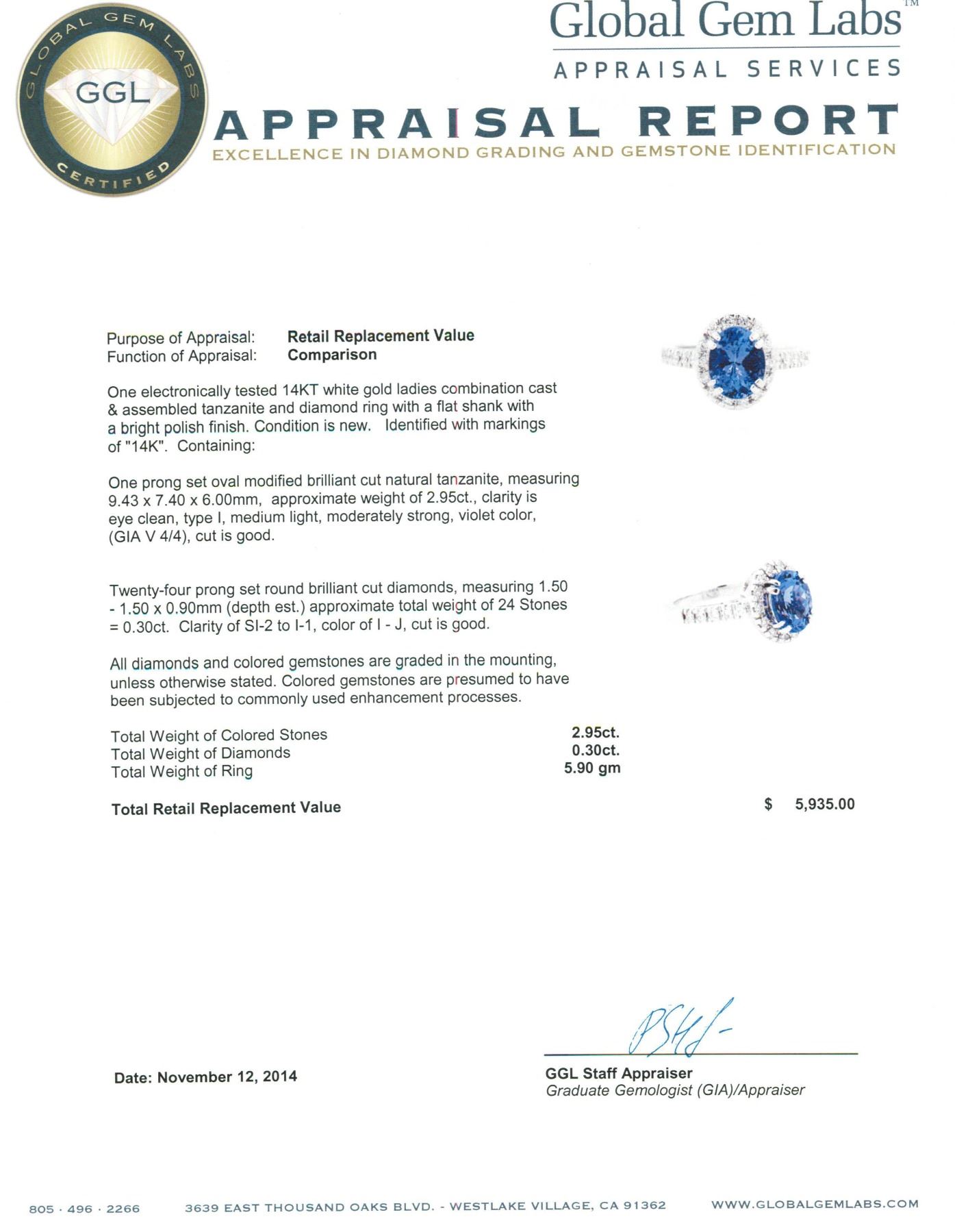 One electronically tested 14KT white gold ladies combination cast & assembled tanzanite and diamond ring with a flat shank with a bright polish finish. Identified with markings of "14K". Condition is new. Containing: One prong set oval modified brilliant cut natural tanzanite, measuring 9.43 x 7.40 x 6.00mm, approximate weight of 2.95ct., clarity is eye clean, type I, medium light, moderately strong, violet color, (GIA V 4/4), cut is good. Twenty-Four prong set round brilliant cut diamonds, measuring 1.50 - 1.50 x 0.90mm (depth est.) approximate total weight of 24 Stones = 0.30 ct. Clarity: SI-2 to I-1. Color: I - J, Cut is Good. All diamonds and colored gemstones are graded in the mounting, unless otherwise stated. Colored gemstones are presumed to have been subjected to commonly used enhancement processes. Total Weight of Colored Stones 2.95ct. Total Weight of Diamonds 0.30 ct. Total Weight of Ring 5.90 grams. GGL Appraised.