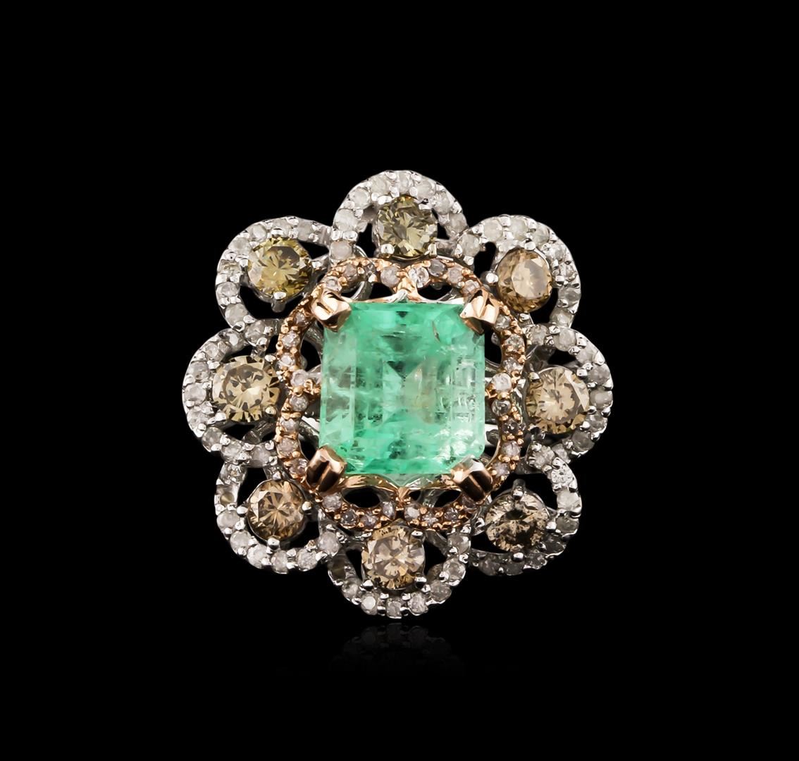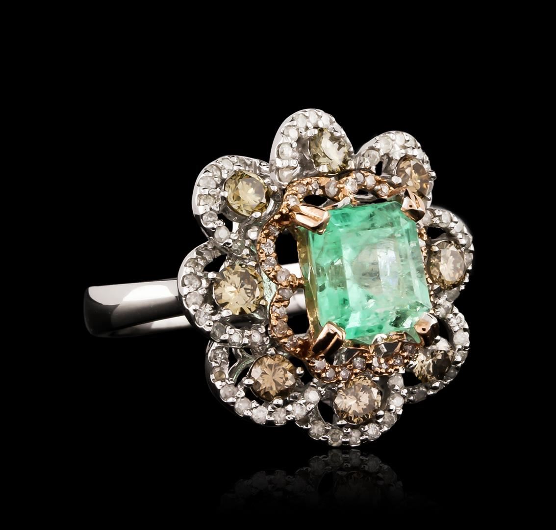One electronically tested 14KT white gold ladies cast emerald and diamond ring. The featured emerald is set within a stylized diamond set floral bezel, completed by a three millimeter wide band. Bright polish finish with rose gold accents. Identified with markings of "K14". Condition is new, good workmanship. Containing: One prong set emerald step cut natural emerald, measuring 8.00 x 7.65 x 6.10mm, 8% bulge factor, approximate weight of 2.96ct., clarity is moderately included, type III, medium, very slightly grayish, very slightly bluish green color, (GIA vslbG 5/3), cut is good. Transmitting light with a minimum of distortion, transparent. Naturally occurring internal & external characteristics are present. Indications of oil residue. Graded in the setting. Eight prong set round brilliant cut diamonds, measuring 3.20 - 3.10 x 1.89mm (depth est.) approximate total weight of 8 Stones = 1.01ct. Color grade is an average for the group. Graded in the setting. Clarity: SI-1 to I-1 One Hundred prong set round brilliant cut diamonds, measuring 1.20 - 1.10 x 0.69mm (depth est.) approximate total weight of 100 Stones = 0.65ct. Graded in the setting. Clarity: I-1 to I-3. Color: H - J. Total Weight of Colored Stones 2.96ct. Total Weight of Diamonds 1.66ct. Total Weight of Ring 8.37 grams. AIG Appraised at $9,240.00.