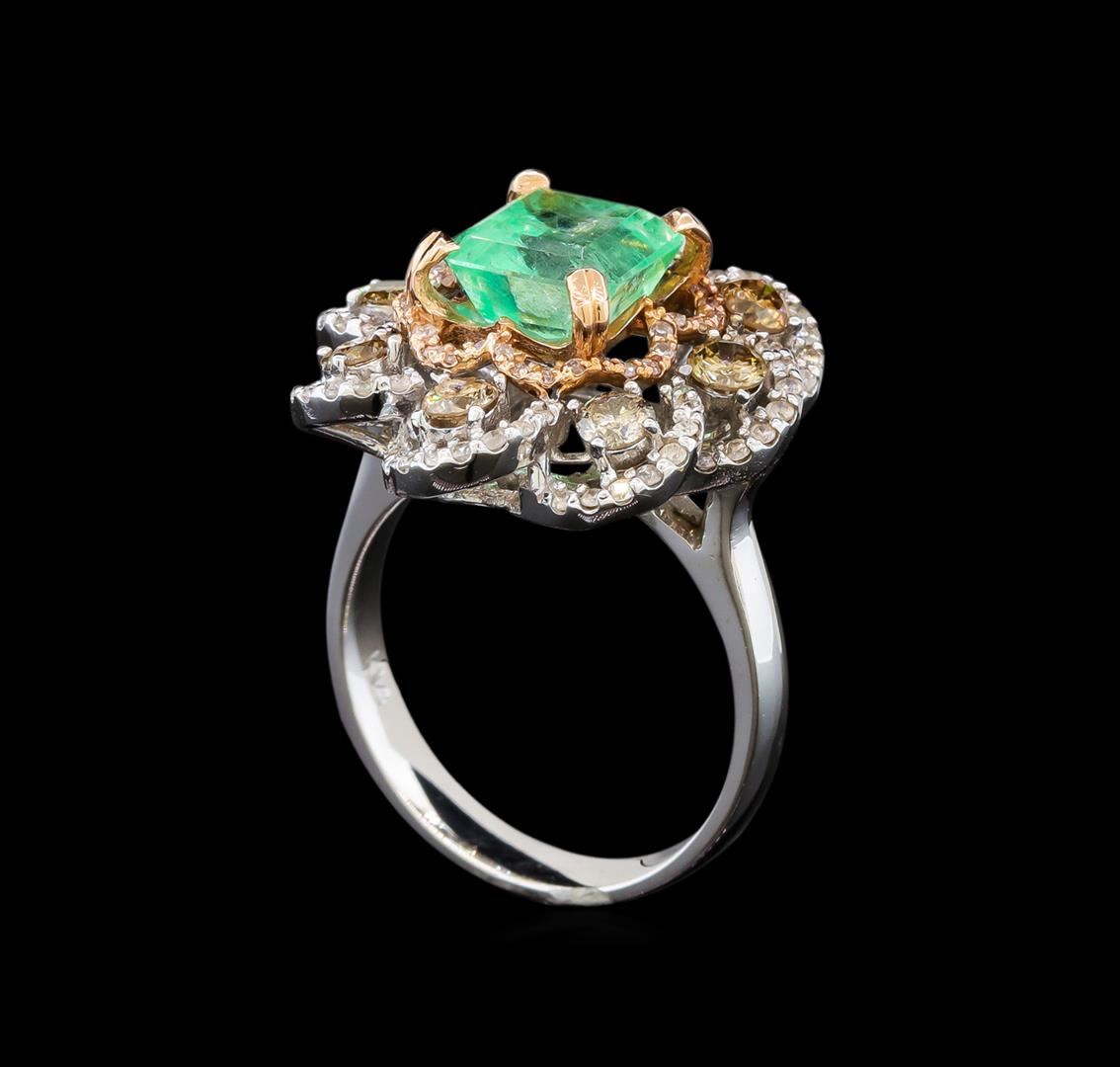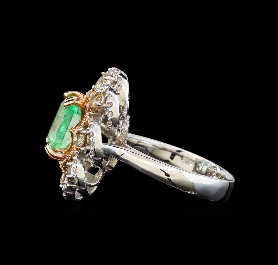 One electronically tested 14KT white gold ladies cast emerald and diamond ring. The featured emerald is set within a stylized diamond set floral bezel, completed by a three millimeter wide band. Bright polish finish with rose gold accents. Identified with markings of "K14". Condition is new, good workmanship. Containing: One prong set emerald step cut natural emerald, measuring 8.00 x 7.65 x 6.10mm, 8% bulge factor, approximate weight of 2.96ct., clarity is moderately included, type III, medium, very slightly grayish, very slightly bluish green color, (GIA vslbG 5/3), cut is good. Transmitting light with a minimum of distortion, transparent. Naturally occurring internal & external characteristics are present. Indications of oil residue. Graded in the setting. Eight prong set round brilliant cut diamonds, measuring 3.20 - 3.10 x 1.89mm (depth est.) approximate total weight of 8 Stones = 1.01ct. Color grade is an average for the group. Graded in the setting. Clarity: SI-1 to I-1 One Hundred prong set round brilliant cut diamonds, measuring 1.20 - 1.10 x 0.69mm (depth est.) approximate total weight of 100 Stones = 0.65ct. Graded in the setting. Clarity: I-1 to I-3. Color: H - J. Total Weight of Colored Stones 2.96ct. Total Weight of Diamonds 1.66ct. Total Weight of Ring 8.37 grams. AIG Appraised at $9,240.00.