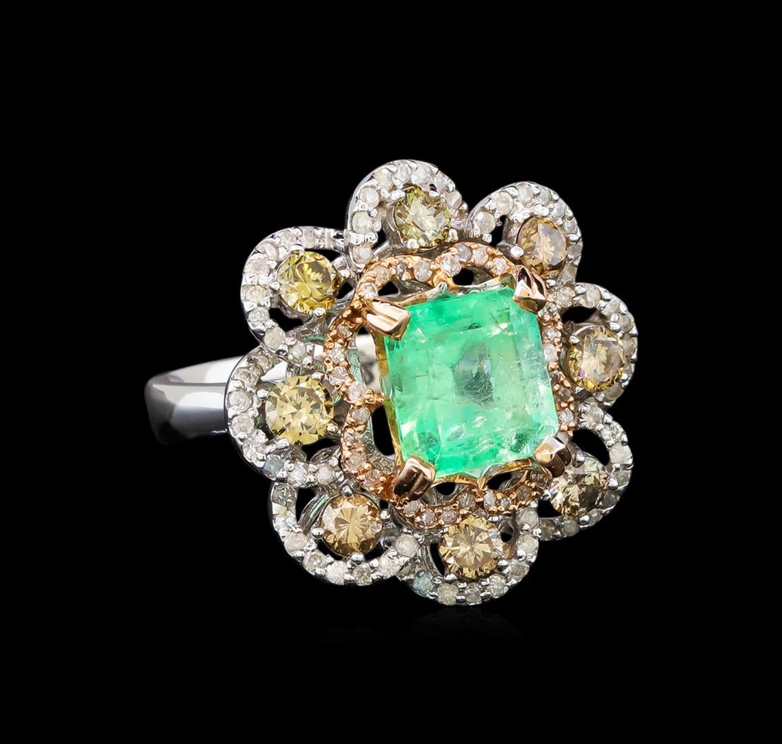 One electronically tested 14KT white gold ladies cast emerald and diamond ring. The featured emerald is set within a stylized diamond set floral bezel, completed by a three millimeter wide band. Bright polish finish with rose gold accents. Identified with markings of "K14". Condition is new, good workmanship. Containing: One prong set emerald step cut natural emerald, measuring 8.00 x 7.65 x 6.10mm, 8% bulge factor, approximate weight of 2.96ct., clarity is moderately included, type III, medium, very slightly grayish, very slightly bluish green color, (GIA vslbG 5/3), cut is good. Transmitting light with a minimum of distortion, transparent. Naturally occurring internal & external characteristics are present. Indications of oil residue. Graded in the setting. Eight prong set round brilliant cut diamonds, measuring 3.20 - 3.10 x 1.89mm (depth est.) approximate total weight of 8 Stones = 1.01ct. Color grade is an average for the group. Graded in the setting. Clarity: SI-1 to I-1 One Hundred prong set round brilliant cut diamonds, measuring 1.20 - 1.10 x 0.69mm (depth est.) approximate total weight of 100 Stones = 0.65ct. Graded in the setting. Clarity: I-1 to I-3. Color: H - J. Total Weight of Colored Stones 2.96ct. Total Weight of Diamonds 1.66ct. Total Weight of Ring 8.37 grams. AIG Appraised at $9,240.00.