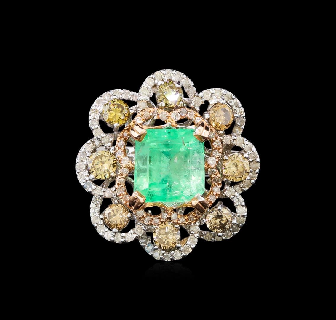 One electronically tested 14KT white gold ladies cast emerald and diamond ring. The featured emerald is set within a stylized diamond set floral bezel, completed by a three millimeter wide band. Bright polish finish with rose gold accents. Identified with markings of "K14". Condition is new, good workmanship. Containing: One prong set emerald step cut natural emerald, measuring 8.00 x 7.65 x 6.10mm, 8% bulge factor, approximate weight of 2.96ct., clarity is moderately included, type III, medium, very slightly grayish, very slightly bluish green color, (GIA vslbG 5/3), cut is good. Transmitting light with a minimum of distortion, transparent. Naturally occurring internal & external characteristics are present. Indications of oil residue. Graded in the setting. Eight prong set round brilliant cut diamonds, measuring 3.20 - 3.10 x 1.89mm (depth est.) approximate total weight of 8 Stones = 1.01ct. Color grade is an average for the group. Graded in the setting. Clarity: SI-1 to I-1 One Hundred prong set round brilliant cut diamonds, measuring 1.20 - 1.10 x 0.69mm (depth est.) approximate total weight of 100 Stones = 0.65ct. Graded in the setting. Clarity: I-1 to I-3. Color: H - J. Total Weight of Colored Stones 2.96ct. Total Weight of Diamonds 1.66ct. Total Weight of Ring 8.37 grams. AIG Appraised at $9,240.00.