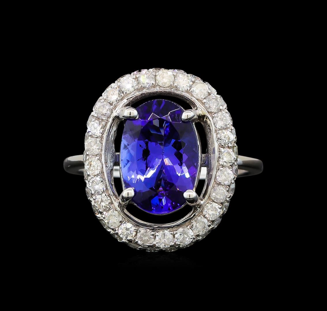 One electronically tested 14KT white gold ladies cast tanzanite and diamond ring with a flat shank with a bright polish finish. Trademark is Orianne. Identified with markings of "14K". Condition is new. Containing: One prong set oval modified brilliant cut natural tanzanite, measuring 11.20 x 7.60 x 4.94mm, approximate weight of 2.96ct., clarity is eye clean, type I, medium, very slightly grayish, bluish violet color, (GIA bV 5/3), cut is good. Fifty-Four prong set round brilliant cut diamonds, measuring 1.80 - 1.80 x 1.08mm (depth est.) approximate total weight of 54 Stones = 1.15ct. Clarity: I-1 to I-2. Color: I - J. All diamonds and colored gemstones are graded in the mounting, unless otherwise stated. Colored gemstones are presumed to have been subjected to commonly used enhancement processes. Total Weight of Colored Stones 2.96ct. Total Weight of Diamonds 1.15ct. Total Weight of Ring 4.80 grams. GGL Appraised at $4,985.00.