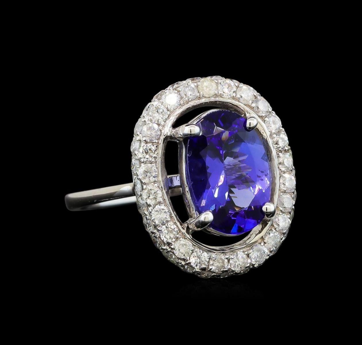 One electronically tested 14KT white gold ladies cast tanzanite and diamond ring with a flat shank with a bright polish finish. Trademark is Orianne. Identified with markings of "14K". Condition is new. Containing: One prong set oval modified brilliant cut natural tanzanite, measuring 11.20 x 7.60 x 4.94mm, approximate weight of 2.96ct., clarity is eye clean, type I, medium, very slightly grayish, bluish violet color, (GIA bV 5/3), cut is good. Fifty-Four prong set round brilliant cut diamonds, measuring 1.80 - 1.80 x 1.08mm (depth est.) approximate total weight of 54 Stones = 1.15ct. Clarity: I-1 to I-2. Color: I - J. All diamonds and colored gemstones are graded in the mounting, unless otherwise stated. Colored gemstones are presumed to have been subjected to commonly used enhancement processes. Total Weight of Colored Stones 2.96ct. Total Weight of Diamonds 1.15ct. Total Weight of Ring 4.80 grams.