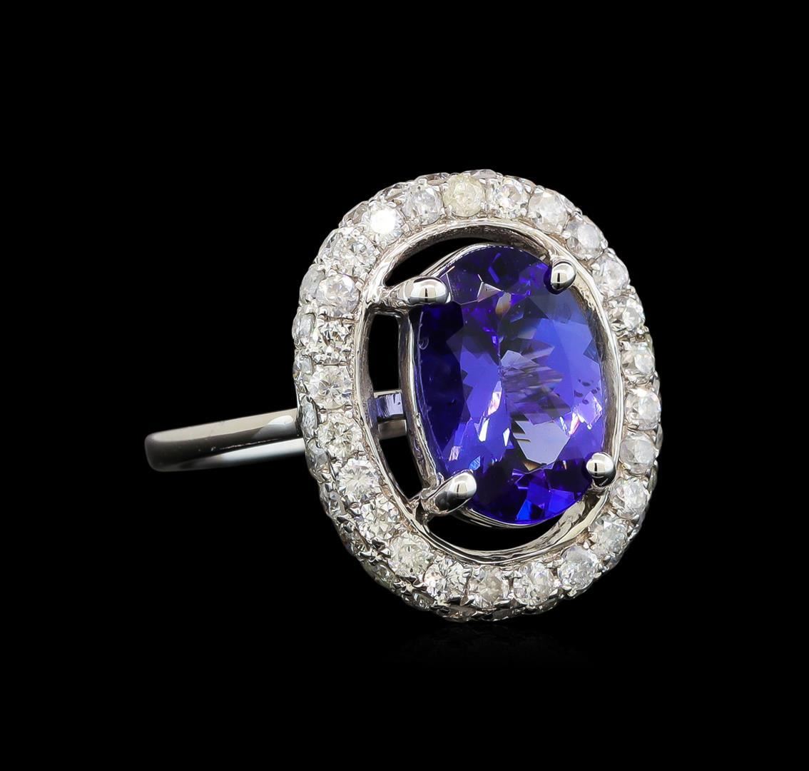 One electronically tested 14KT white gold ladies cast tanzanite and diamond ring with a flat shank with a bright polish finish. Trademark is Orianne. Identified with markings of "14K". Condition is new. Containing: One prong set oval modified brilliant cut natural tanzanite, measuring 11.20 x 7.60 x 4.94mm, approximate weight of 2.96ct., clarity is eye clean, type I, medium, very slightly grayish, bluish violet color, (GIA bV 5/3), cut is good. Fifty-Four prong set round brilliant cut diamonds, measuring 1.80 - 1.80 x 1.08mm (depth est.) approximate total weight of 54 Stones = 1.15ct. Clarity: I-1 to I-2. Color: I - J. All diamonds and colored gemstones are graded in the mounting, unless otherwise stated. Colored gemstones are presumed to have been subjected to commonly used enhancement processes. Total Weight of Colored Stones 2.96ct. Total Weight of Diamonds 1.15ct. Total Weight of Ring 4.80 grams.