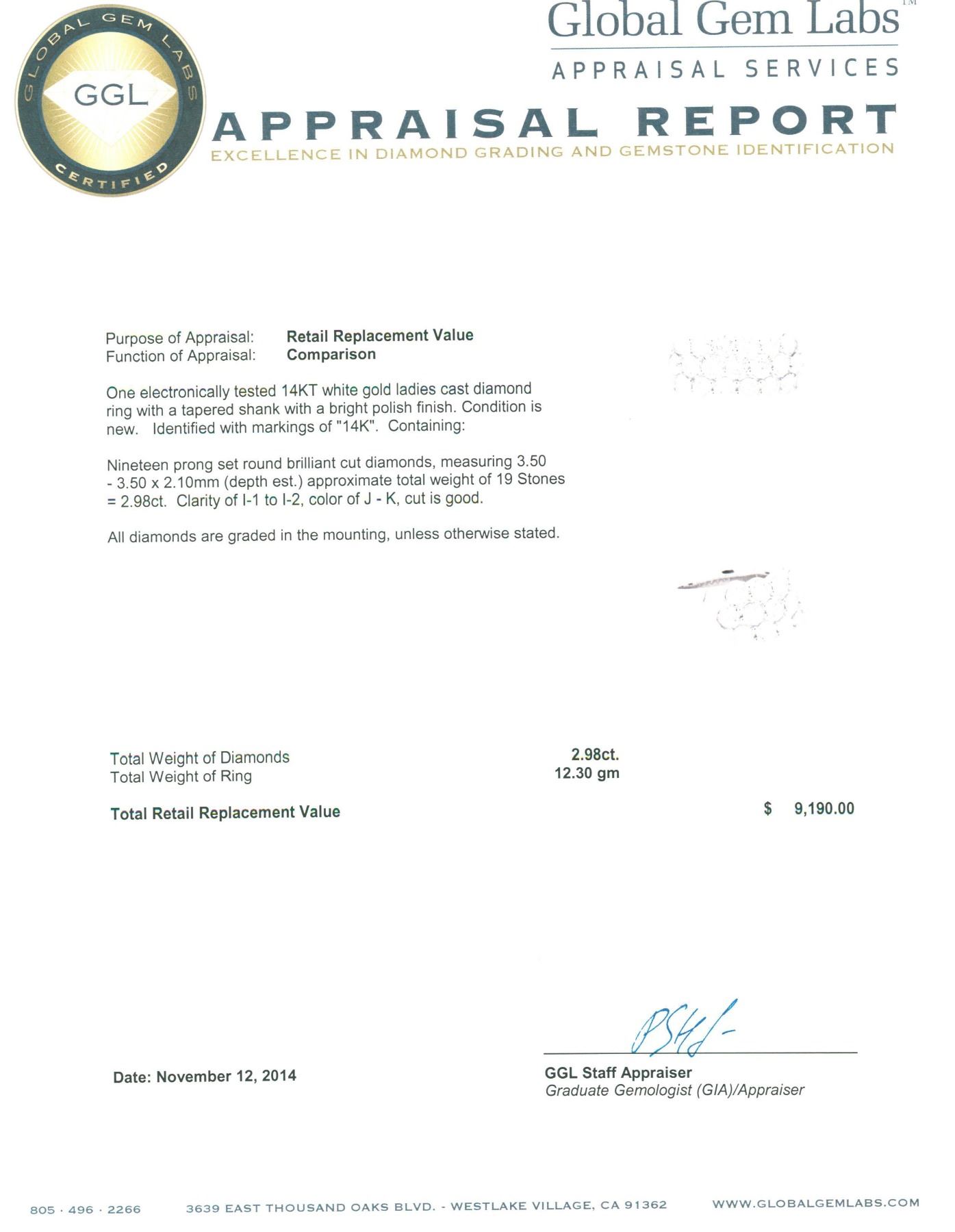 One electronically tested 14KT white gold ladies cast diamond ring with a tapered shank with a bright polish finish. Identified with markings of "14K". Condition is new. Containing: Nineteen prong set round brilliant cut diamonds, measuring 3.50 - 3.50 x 2.10mm (depth est.) approximate total weight of 19 Stones = 2.98ct. Clarity: I-1 to I-2. Color: J - K, Cut is Good. All diamonds are graded in the mounting, unless otherwise stated. Total Weight of Diamonds 2.98ct. Total Weight of Ring 12.30 grams. GGL Appraised.