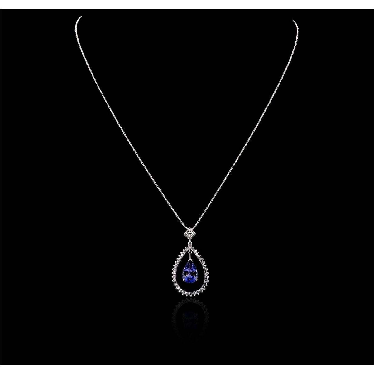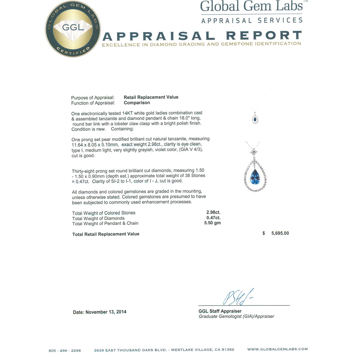 One electronically tested 14KT white gold ladies combination cast & assembled tanzanite and diamond pendant & chain 18.0" long, round bar link with a lobster claw clasp with a bright polish finish. Condition is new. Containing: One prong set pear modified brilliant cut natural tanzanite, measuring 11.64 x 8.05 x 5.10mm, exact weight 2.98ct., clarity is eye clean, type I, medium light, very slightly grayish, violet color, (GIA V 4/3), cut is good. Thirty-Eight prong set round brilliant cut diamonds, measuring 1.50 - 1.50 x 0.90mm (depth est.) approximate total weight of 38 Stones = 0.47ct. Clarity: SI-2 to I-1. Color: I - J, Cut is Good. All diamonds and colored gemstones are graded in the mounting, unless otherwise stated. Colored gemstones are presumed to have been subjected to commonly used enhancement processes. Total Weight of Colored Stones 2.98ct. Total Weight of Diamonds 0.47ct. Total Weight of Pendant & Chain 5.50 grams. GGL Appraised at $5,695.00.