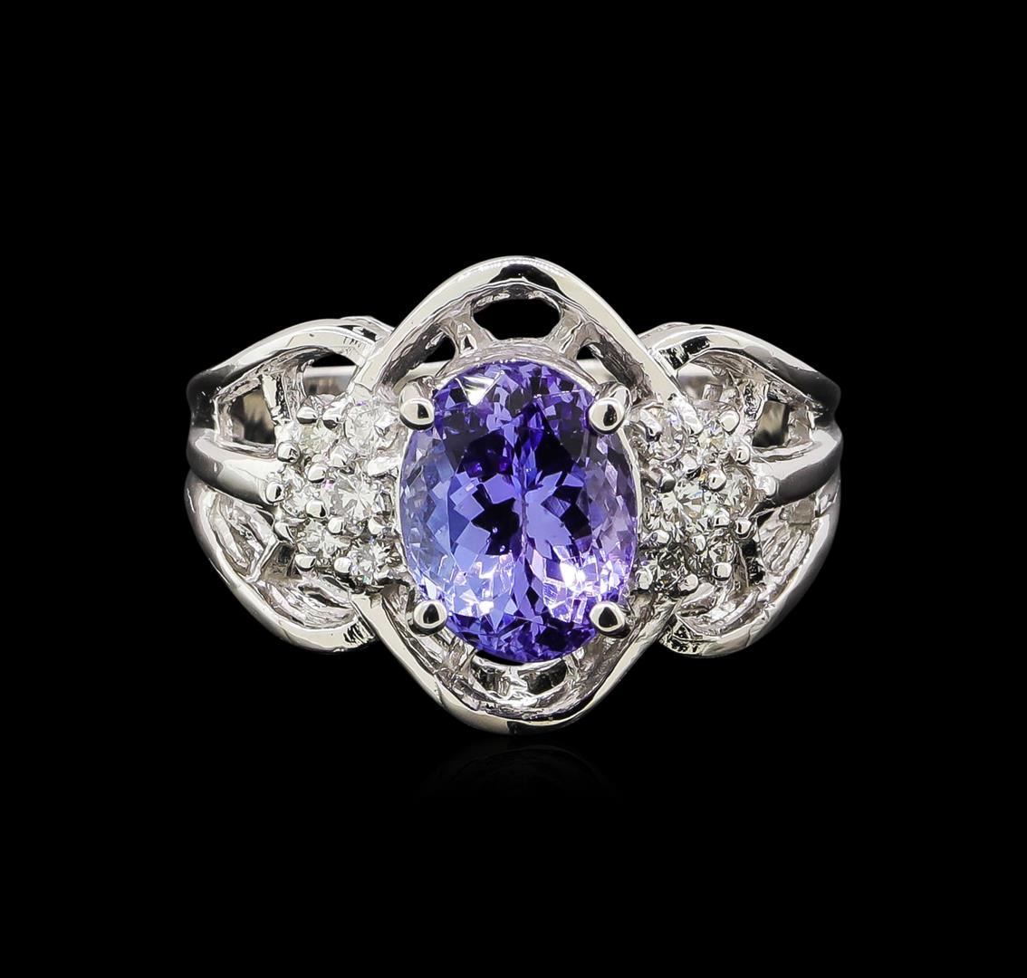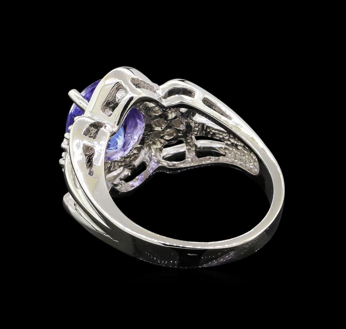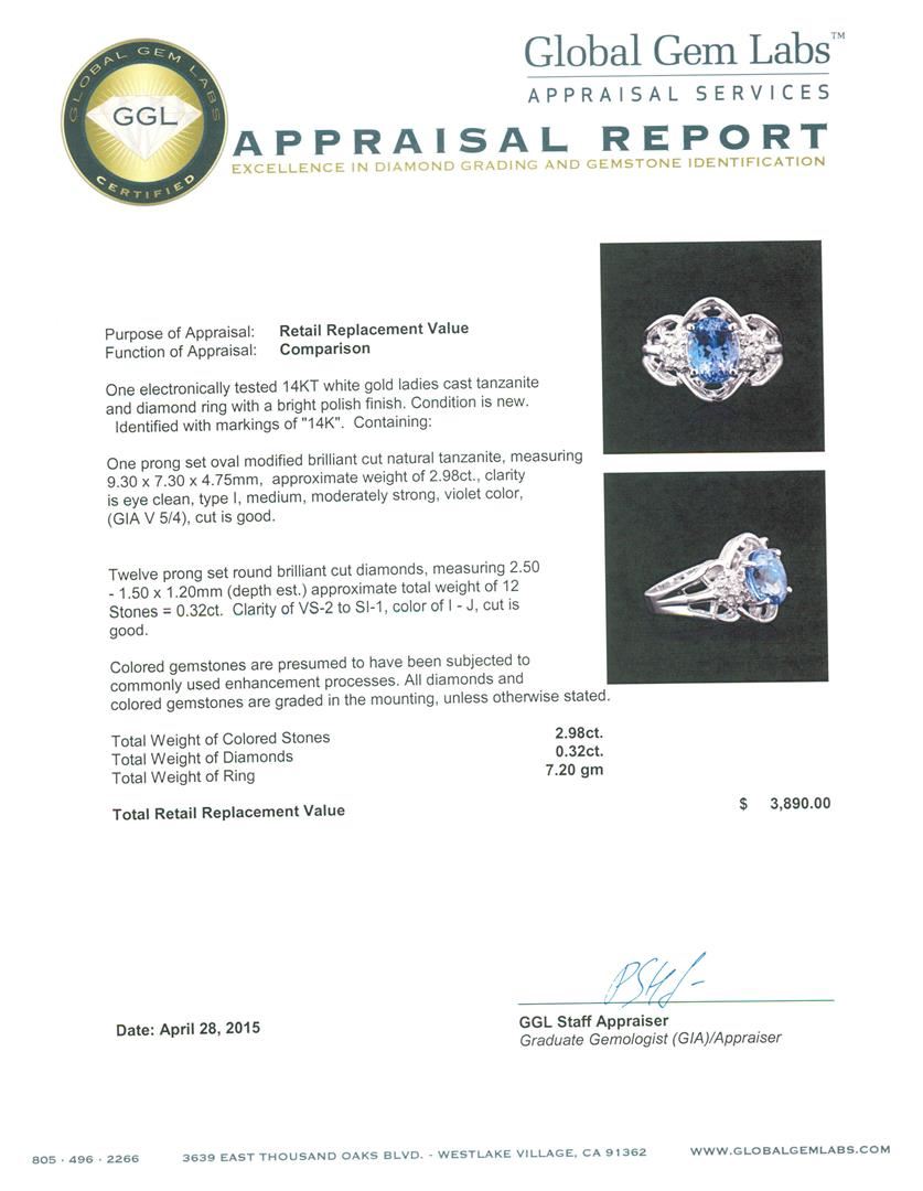 One electronically tested 14KT white gold ladies cast tanzanite and diamond ring with a bright polish finish. Identified with markings of "14K". Condition is new. Containing: One prong set oval modified brilliant cut natural tanzanite, measuring 9.30 x 7.30 x 4.75mm, approximate weight of 2.98ct., clarity is eye clean, type I, medium, moderately strong, violet color, (GIA V 5/4), cut is good. Twelve prong set round brilliant cut diamonds, measuring 2.50 - 1.50 x 1.20mm (depth est.) approximate total weight of 12 Stones = 0.32ct. Clarity: VS-2 to SI-1. Color: I - J, Cut is Good. Colored gemstones are presumed to have been subjected to commonly used enhancement processes. All diamonds and colored gemstones are graded in the mounting, unless otherwise stated. Total Weight of Colored Stones 2.98ct. Total Weight of Diamonds 0.32ct. Total Weight of Ring 7.20 grams. GGL Appraised at $3,890.00.