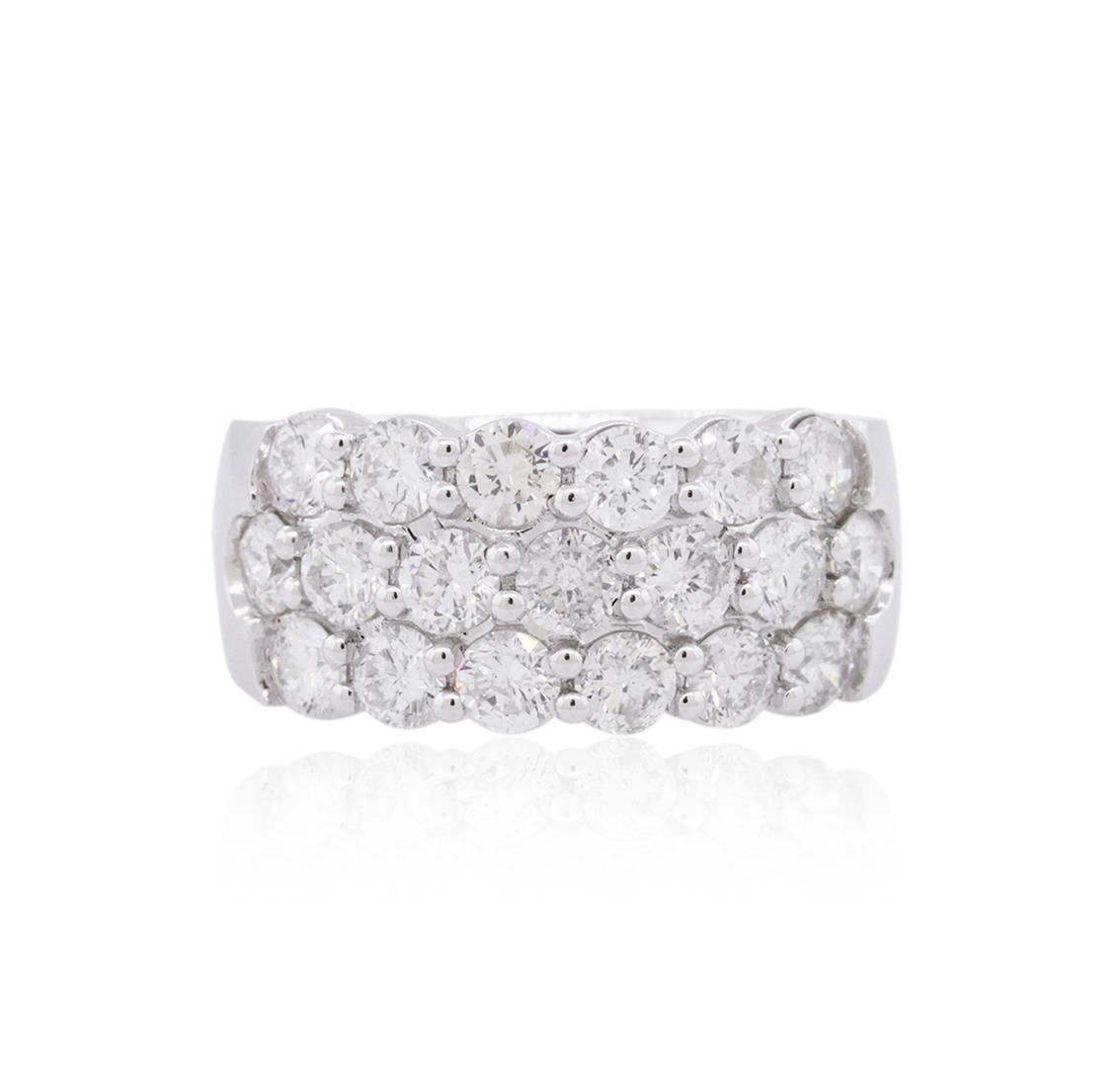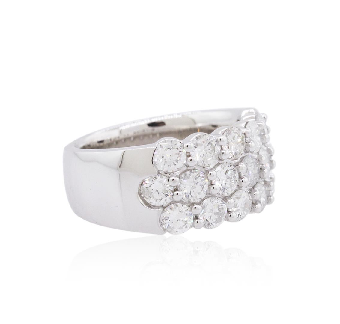 One electronically tested 14KT white gold ladies cast diamond ring with a tapered shank with a bright polish finish. Identified with markings of "14K". Condition is new. Containing: Nineteen prong set round brilliant cut diamonds, measuring 3.50 - 3.50 x 2.10mm (depth est.) approximate total weight of 19 Stones = 2.98ct. Clarity: I-1 to I-2. Color: J - K, Cut is Good. All diamonds are graded in the mounting, unless otherwise stated. Total Weight of Diamonds 2.98ct. Total Weight of Ring 12.30 grams. GGL Appraised at $9,190.00.