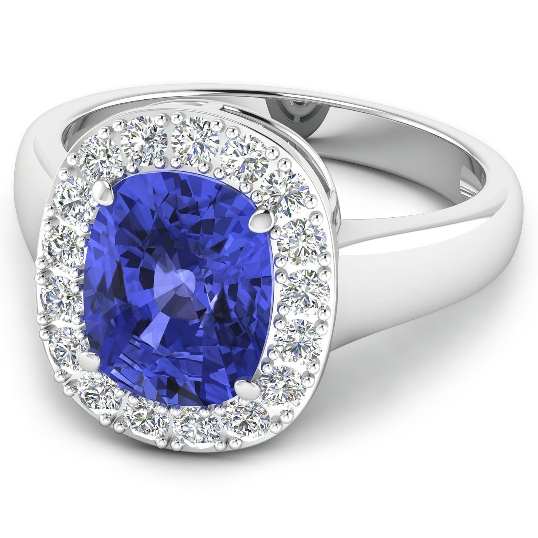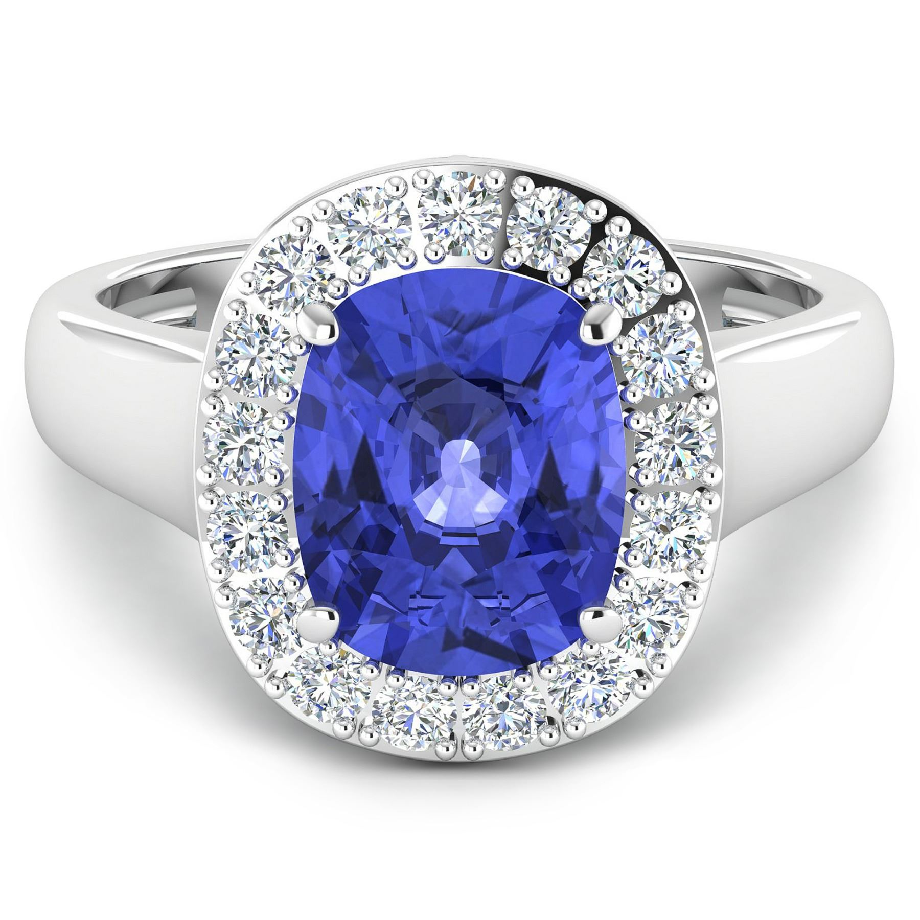 Tanzanite (AA+) Cushion 10x8mm - 1Pc + White Diamond F/C Round 2.00mm - 17Pcs ( Diamond Quality : SI-2/HI ). Total weight of gemstone is 2.9cts. Total weight of Diamonds is 0.51cts. Total weight of this ring is 4.27 grams. Ring size 7.