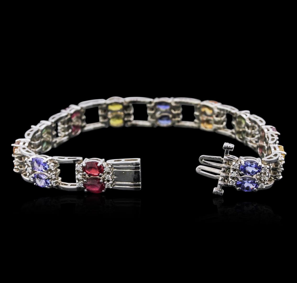 One electronically tested 14KT white gold ladies cast tanzanite, ruby, sapphire and diamond bracelet with a hidden box clasp with a bright polish finish. Measurements: 7 inches in length Condition is new. Containing: Four prong set oval modified brilliant cut natural tanzanites, measuring 6.00. x 4.00. x 2.60mm, approximate total weight of 3.50ct., clarity is eye clean, type I, medium light, very slightly grayish, violet color, (GIA V 4/3), cut is good. Six prong set oval modified brilliant cut natural rubies, measuring 6.00. x 4.00. x 2.60mm, approximate total weight of 4.74ct., clarity is heavily included, type II, medium, moderately strong, red color, (GIA R 5/4), cut is good. Four prong set oval modified brilliant cut natural orange sapphires, measuring 6.00. x 4.00. x 2.60mm, approximate total weight of 3.50ct., clarity is slightly included, type II, medium light, brownish, orange color, (GIA O 4/3), cut is good. Four prong set oval modified brilliant cut natural green sapphires, measuring 6.00. x 4.00. x 2.60mm, approximate total weight of 3.50ct., clarity is moderately included, medium, very slightly grayish, bluish green color, (GIA bG 5/3), cut is good. Four prong set oval modified brilliant cut natural yellow sapphires, measuring 6.00. x 4.00. x 2.60mm, approximate total weight of 3.80ct., clarity is moderately included, type II, medium light, yellow color, (GIA Y 4/0), cut is good. Two prong set oval modified brilliant cut natural blue sapphires, measuring 6.00. x 4.00. x 2.60mm, approximate total weight of 1.00.ct., clarity is slightly included, type II, medium light, very slightly grayish, blue color, (GIA B 4/3), cut is good. Seventy-Two prong set round brilliant cut diamonds, measuring 1.50 - 1.50 x 0.90mm (depth est.) approximate total weight of 72 Stones = 1.10ct. Clarity: SI-2 to I-1. Color: I - J, Cut is Good. Colored gemstones are presumed to have been subjected to commonly used enhancement processes. All diamonds and colored gemstones are graded in the mounting, unless otherwise stated. Total Weight of Colored Stones 20.04ct. Total Weight of Diamonds 1.10ct. Total Weight of Bracelet 24.60 grams. GGL Appraised at $7,345.00.