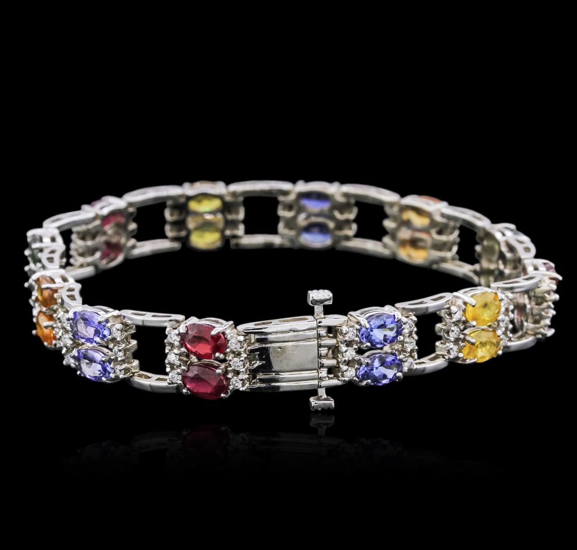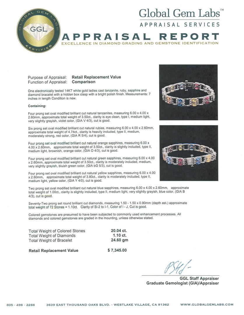 One electronically tested 14KT white gold ladies cast tanzanite, ruby, sapphire and diamond bracelet with a hidden box clasp with a bright polish finish. Measurements: 7 inches in length Condition is new. Containing: Four prong set oval modified brilliant cut natural tanzanites, measuring 6.00. x 4.00. x 2.60mm, approximate total weight of 3.50ct., clarity is eye clean, type I, medium light, very slightly grayish, violet color, (GIA V 4/3), cut is good. Six prong set oval modified brilliant cut natural rubies, measuring 6.00. x 4.00. x 2.60mm, approximate total weight of 4.74ct., clarity is heavily included, type II, medium, moderately strong, red color, (GIA R 5/4), cut is good. Four prong set oval modified brilliant cut natural orange sapphires, measuring 6.00. x 4.00. x 2.60mm, approximate total weight of 3.50ct., clarity is slightly included, type II, medium light, brownish, orange color, (GIA O 4/3), cut is good. Four prong set oval modified brilliant cut natural green sapphires, measuring 6.00. x 4.00. x 2.60mm, approximate total weight of 3.50ct., clarity is moderately included, medium, very slightly grayish, bluish green color, (GIA bG 5/3), cut is good. Four prong set oval modified brilliant cut natural yellow sapphires, measuring 6.00. x 4.00. x 2.60mm, approximate total weight of 3.80ct., clarity is moderately included, type II, medium light, yellow color, (GIA Y 4/0), cut is good. Two prong set oval modified brilliant cut natural blue sapphires, measuring 6.00. x 4.00. x 2.60mm, approximate total weight of 1.00.ct., clarity is slightly included, type II, medium light, very slightly grayish, blue color, (GIA B 4/3), cut is good. Seventy-Two prong set round brilliant cut diamonds, measuring 1.50 - 1.50 x 0.90mm (depth est.) approximate total weight of 72 Stones = 1.10ct. Clarity: SI-2 to I-1. Color: I - J, Cut is Good. Colored gemstones are presumed to have been subjected to commonly used enhancement processes. All diamonds and colored gemstones are graded in the mounting, unless otherwise stated. Total Weight of Colored Stones 20.04ct. Total Weight of Diamonds 1.10ct. Total Weight of Bracelet 24.60 grams. GGL Appraised at $7,345.00.