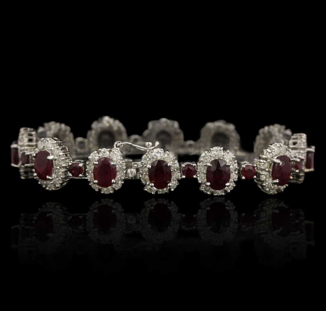 One electronically tested 14KT White Gold Ladies combination cast & assembled fashion bracelet with a hidden box clasp with a bright polish finish. Condition is new. Measurements: 7" inch in length. Identified with markings of "14K". Containing: Twelve prong set oval modified brilliant cut natural rubies, measuring 8.00 x 6.00 x 3.77mm, approximate total weight of 17.76ct., clarity is heavily included, type II, medium dark, moderately strong, strongly purplish red color, (GIA stpR 6/4), cut is good. One Hundred Thirty-Two prong set round brilliant cut diamonds, measuring 2.10 - 2.10 x 1.26mm (depth est.) approximate total weight of 132 Stones = 4.48ct. Clarity of I-1 to I-2, Color of H - I, Cut is Good. Twelve prong set round modified brilliant cut natural rubies, measuring 3.60 - 3.60 x 2.34 mm, approximate total weight of 2.52ct., clarity is heavily included, medium dark, moderately strong, strongly purplish red color, (GIA stpR 6/4), cut is good. Indications of heat treatment with glass and flux residue. Colored gemstones are presumed to have been subjected to commonly used and possible undetectable color/clarity enhancement processes. Total Weight of Colored Stones 20.28ct. Total Weight of Diamonds 4.48ct. Total Weight of Bracelet 36.30gm. GGL Appraised at $26,230.00.