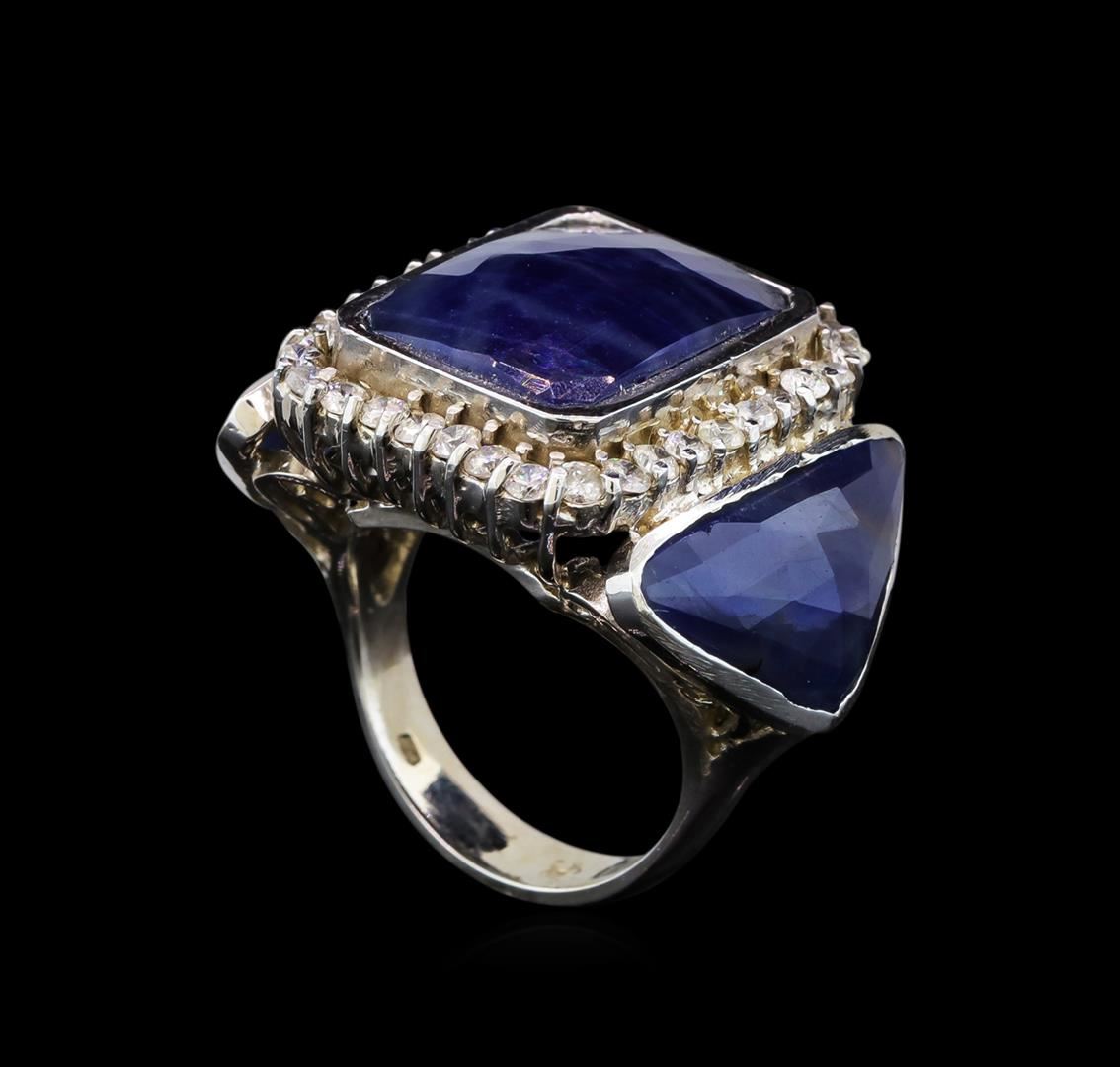 One electronically tested 14KT white gold ladies custom hand made sapphire and diamond ring with a bright polish finish. Identified with markings of "k14". Condition is very good. Containing: One bezel set rectangular modified mixed cut natural blue sapphire, measuring 16.00 x 11.50 x 4.00mm, approximate weight of 8.83ct., clarity is severely included, type II, medium dark, strong, blue color, (GIA B 6/5)Two bezel set triangle modified mixed cut natural blue sapphires, measuring 17.00 x 12.00 x 4.00mm, approximate total weight of 11.76ct., clarity is severely included, type II, medium dark, moderately strong, blue color, (GIA B 6/4)Thirty-Four prong set round brilliant cut diamonds, measuring 2.00 - 2.00 x 1.20mm (depth est.) approximate total weight of 34 Stones = 1.00 ct. Clarity: I-1 to I-3. Color: I - J. Colored gemstones are presumed to have been subjected to commonly used enhancement processes. All diamonds and colored gemstones are graded in the mounting, unless otherwise stated. Total Weight of Colored Stones 20.59ct. Total Weight of Diamonds 1.00 ct. Total Weight of Ring 17.30 grams. GGL Appraised.