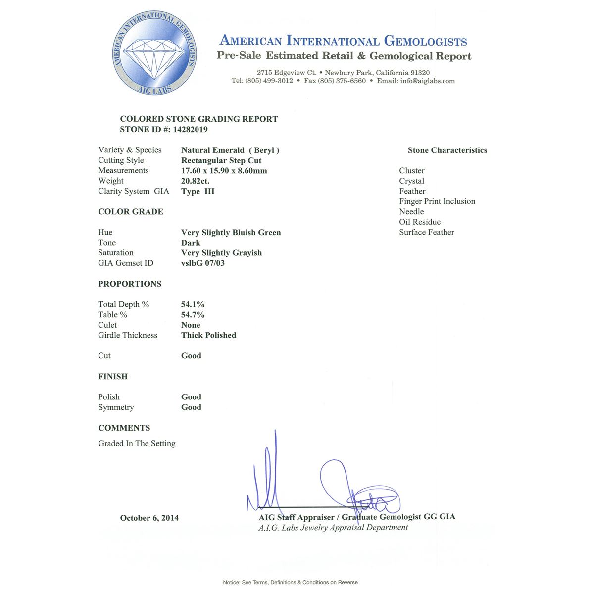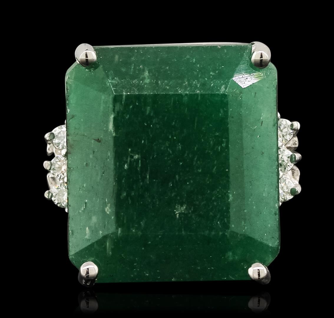 One electronically tested 14KT white gold ladies cast emerald and diamond ring with a bright polish finish. The featured emerald is accented by a diamond trio on either side, completed by a two and one-half millimeter wide band. Identified with markings of "14K". Condition is new, good workmanship. Containing: One prong set rectangular step cut natural emerald, measuring 17.60 x 15.90 x 8.60mm, 6%. bulge factor, approximate weight of 20.82ct., type III, dark, very slightly grayish, very slightly bluish green color, (GIA vslbG 7/3), cut is good. Transmitting light diffusely, translucent to opaque. Naturally occurring internal & external characteristics are present. Colored Stone Grading Report attached. Graded in the setting. Six prong set round brilliant cut diamonds, measuring 2.00 - 1.90 x 1.17mm (depth est.) approximate. Total Weight of 6 Stones = 0.20ct. Graded in the setting. Clarity: SI-1 to SI-2. Color: G - H. Total Weight of Colored Stones 20.82ct. Total Weight of Diamonds 0.20ct. Total Weight of Ring 10.85gm. AIG Appraised at $6,070.00.
