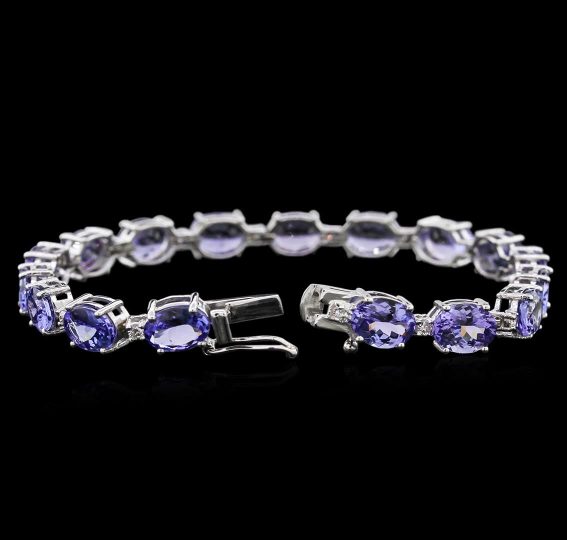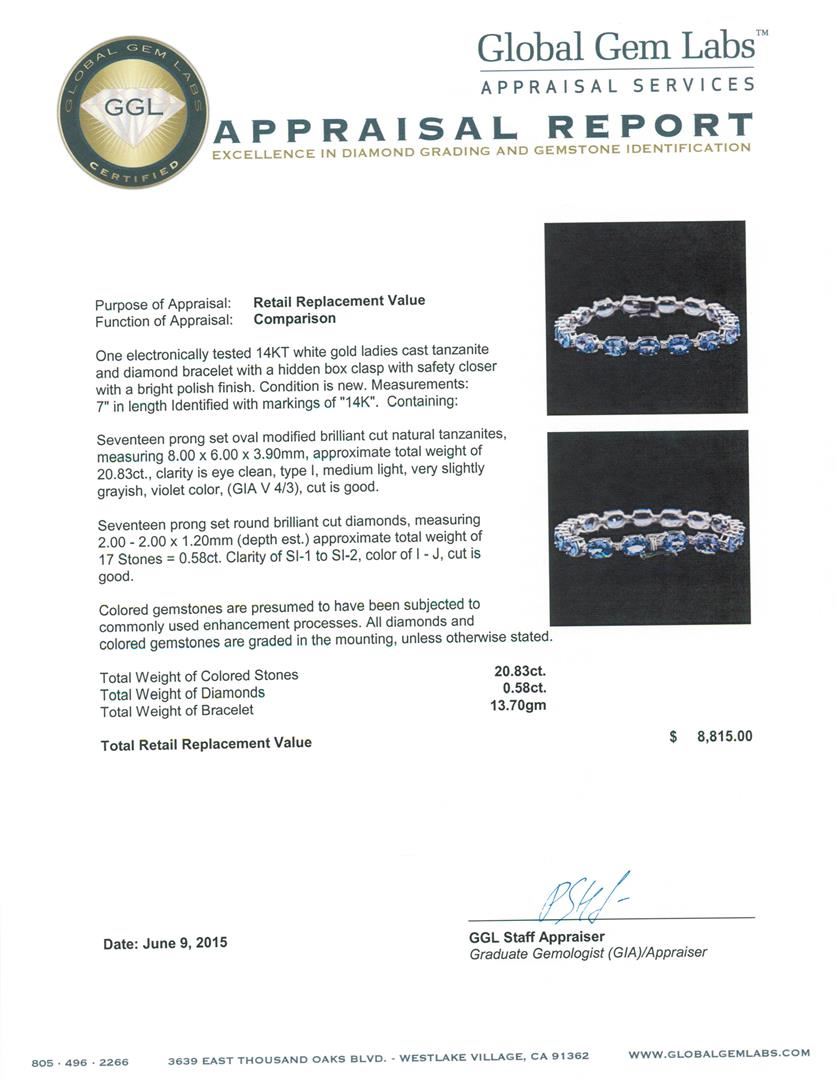 One electronically tested 14KT white gold ladies cast tanzanite and diamond bracelet with a hidden box clasp with safety closer with a bright polish finish. Measurements: 7" in length Identified with markings of "14K". Condition is new. Containing: Seventeen prong set oval modified brilliant cut natural tanzanites, measuring 8.00 x 6.00 x 3.90mm, approximate total weight of 20.83ct., clarity is eye clean, type I, medium light, very slightly grayish, violet color, (GIA V 4/3), cut is good. Seventeen prong set round brilliant cut diamonds, measuring 2.00 - 2.00 x 1.20mm (depth est.) approximate total weight of 17 Stones = 0.58ct. Clarity: SI-1 to SI-2. Color: I - J, Cut is Good. Colored gemstones are presumed to have been subjected to commonly used enhancement processes. All diamonds and colored gemstones are graded in the mounting, unless otherwise stated. Total Weight of Colored Stones 20.83ct. Total Weight of Diamonds 0.58ct. Total Weight of Bracelet 13.70 grams. GGL Appraised at $8,815.00.