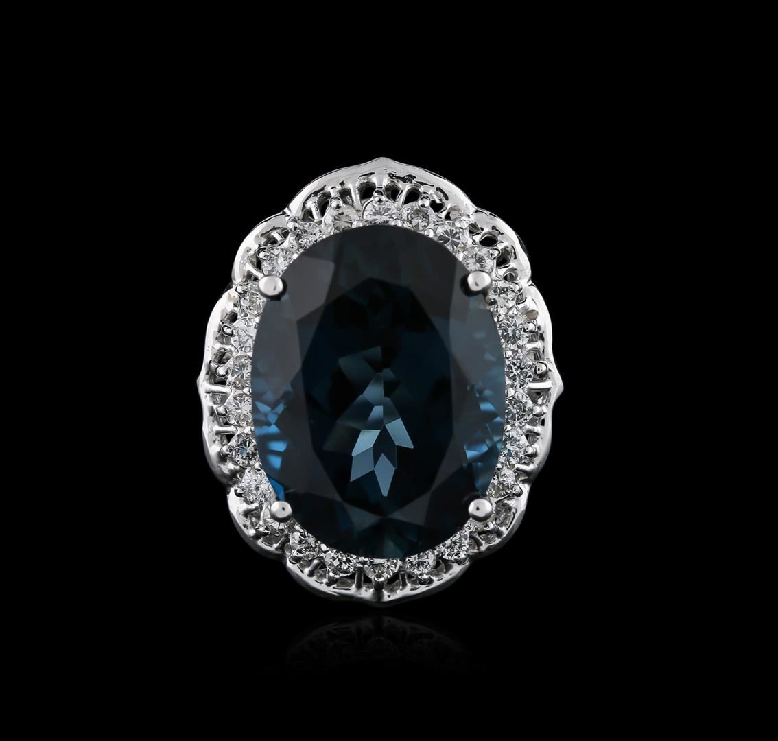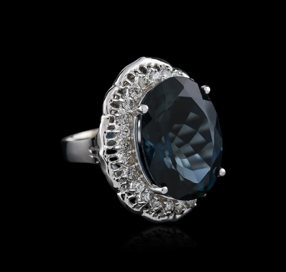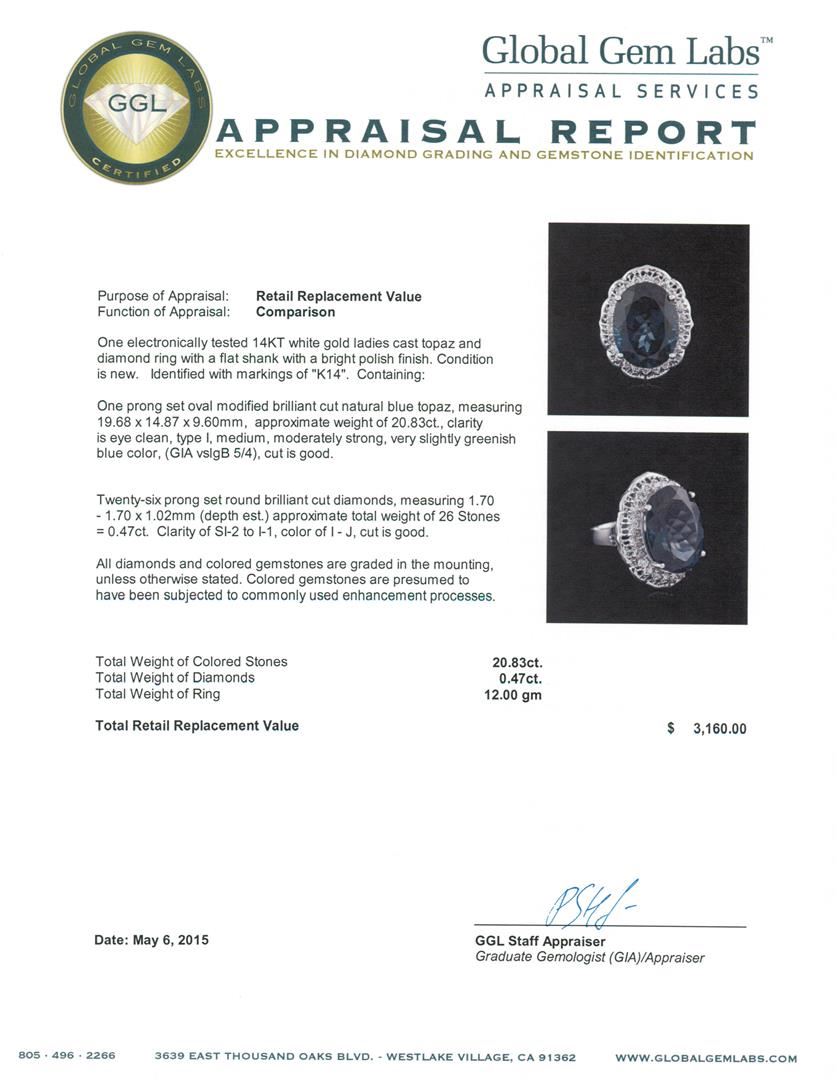 One electronically tested 14KT white gold ladies cast topaz and diamond ring with a flat shank with a bright polish finish. Identified with markings of "K14". Condition is new. Containing: One prong set oval modified brilliant cut natural blue topaz, measuring 19.68 x 14.87 x 9.60mm, approximate weight of 20.83ct., clarity is eye clean, type I, medium, moderately strong, very slightly greenish blue color, (GIA vslgB 5/4), cut is good. Twenty-Six prong set round brilliant cut diamonds, measuring 1.70 - 1.70 x 1.02mm (depth est.) approximate total weight of 26 Stones = 0.47ct. Clarity: SI-2 to I-1. Color: I - J, Cut is Good. All diamonds and colored gemstones are graded in the mounting, unless otherwise stated. Colored gemstones are presumed to have been subjected to commonly used enhancement processes.. Total Weight of Colored Stones 20.83ct. Total Weight of Diamonds 0.47ct. Total Weight of Ring 12.00 grams. GGL Appraised at $3,160.00.
