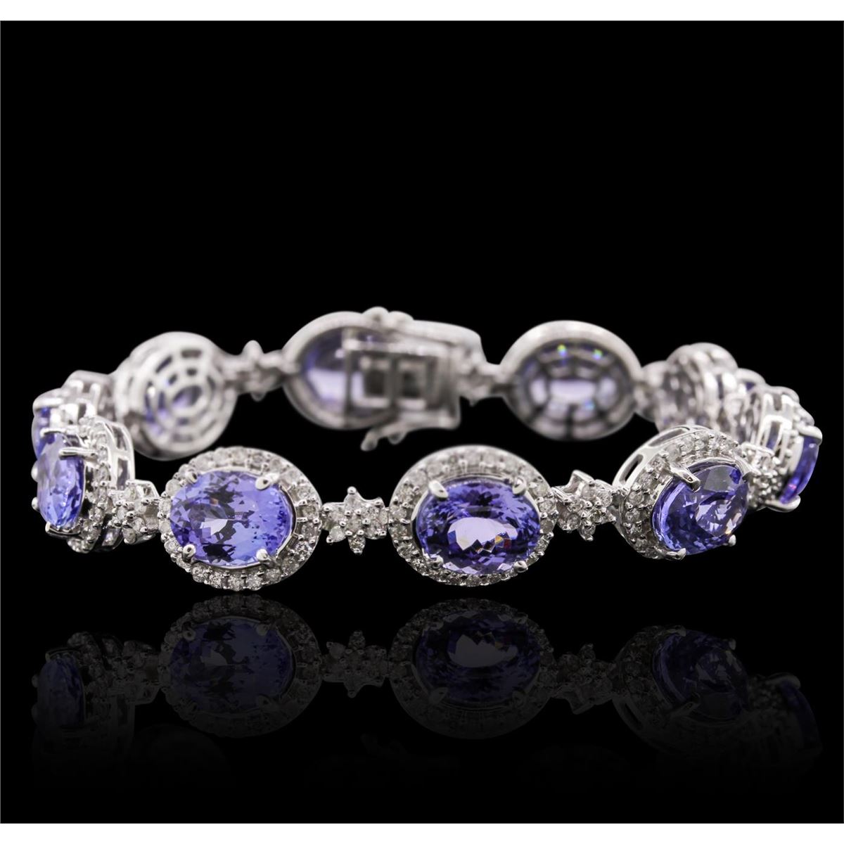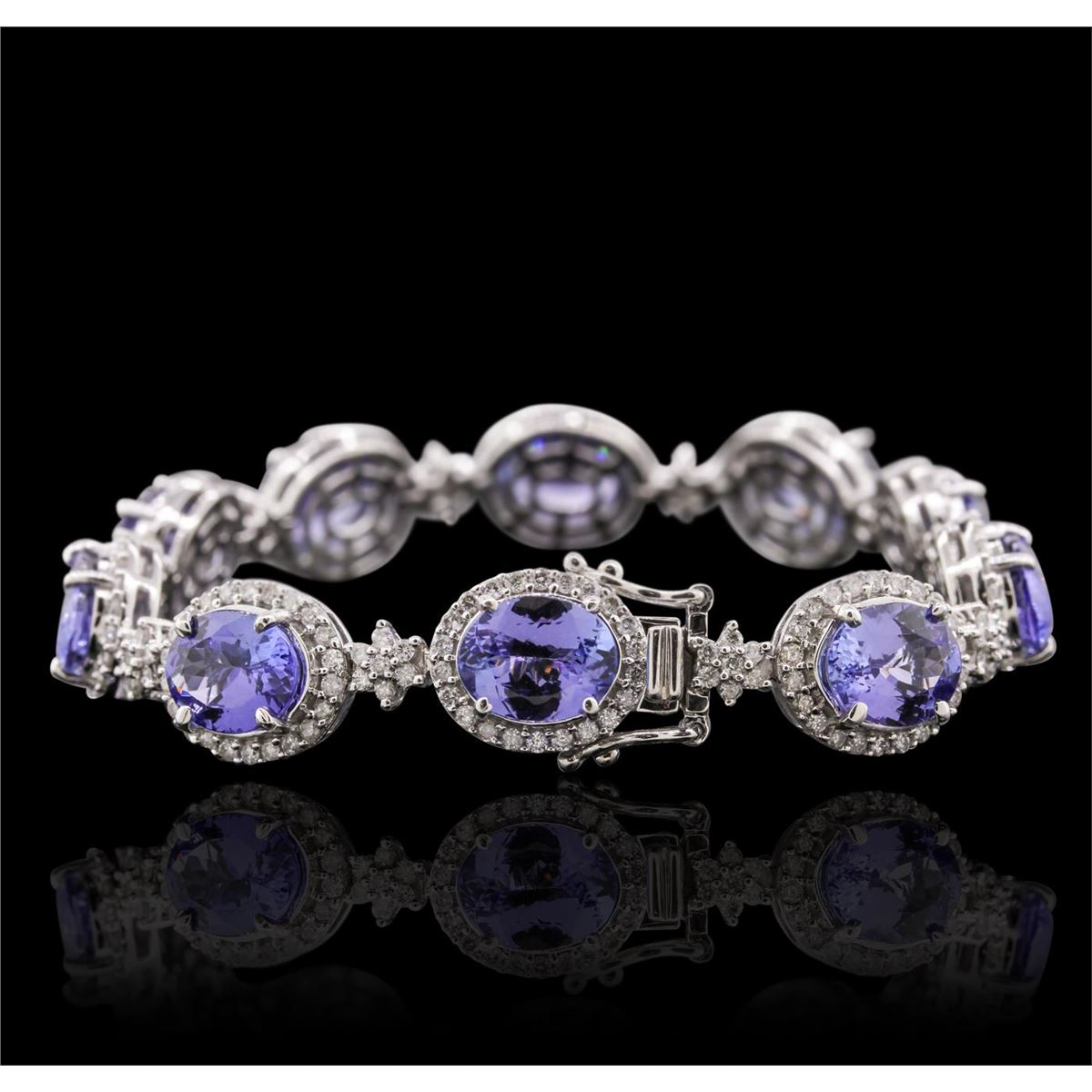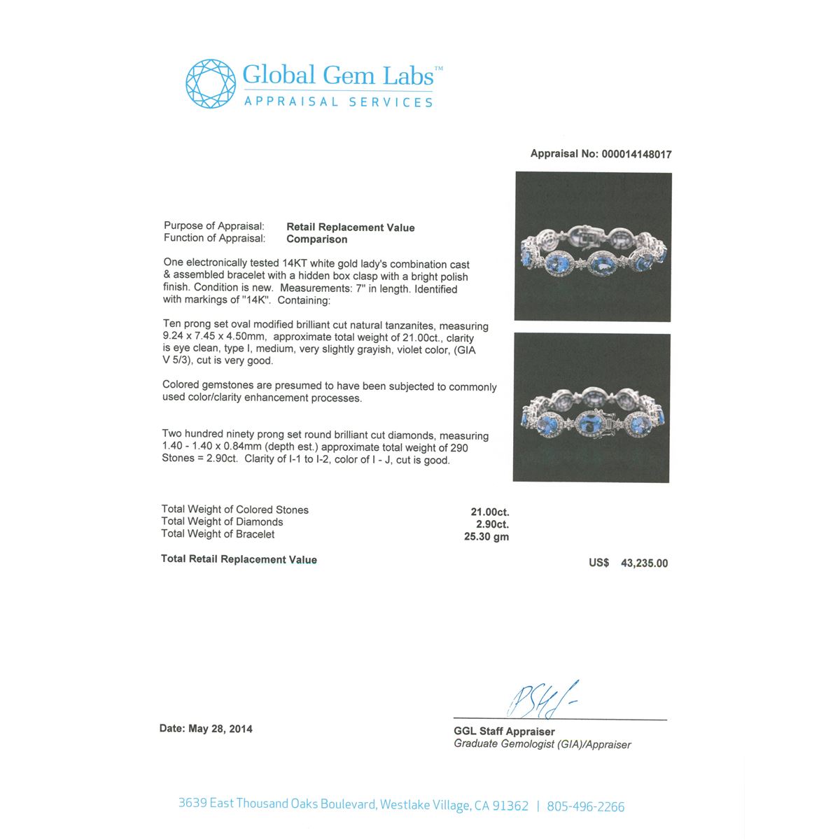 One electronically tested 14KT white gold Ladies combination cast & assembled bracelet with a hidden box clasp with a bright polish finish. Condition is new. Measurements: 7" in length. Identified with markings of "14K". Containing: Ten prong set oval modified brilliant cut natural tanzanites, measuring 9.24 x 7.45 x 4.50mm, approximate. Total Weight of 21.00ct., clarity is eye clean, type I, medium, very slightly grayish, violet color, (GIA V 5/3), cut is very good. Colored gemstones are presumed to have been subjected to commonly used color/clarity enhancement processes. Two Hundred Ninety prong set round brilliant cut diamonds, measuring 1.40 - 1.40 x 0.84mm (depth est.) approximate. Total Weight of 290 Stones = 2.90ct. Clarity: I-1 to I-2. Color: I - J, Cut is Good. Total Weight of Colored Stones 21.00ct. Total Weight of Diamonds 2.90ct. Total Weight of Bracelet 25.30 Grams. GGL Appraised at $43,235.00.