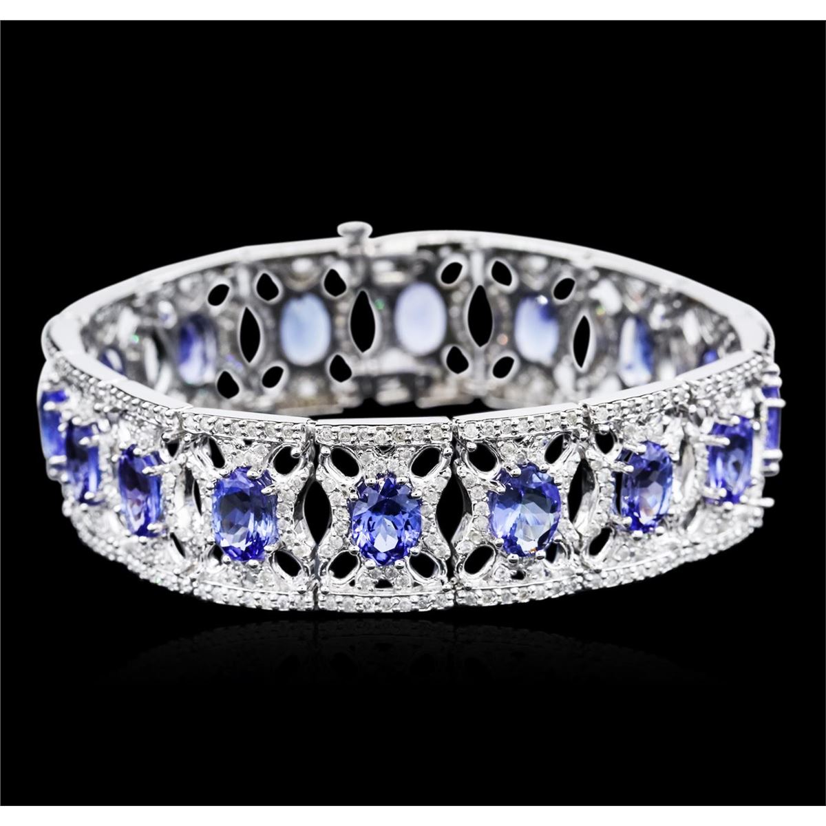 One electronically tested 14KT white gold ladies cast tanzanite and diamond bracelet with a hidden box clasp with a bright polish finish. Measurements: 7.25" in length Condition is new. Containing: Sixteen prong set oval modified brilliant cut natural tanzanites, measuring 8.00 x 6.00 x 3.90mm, approximate total weight of 21.12ct., clarity is eye clean, type I, medium light, very slightly grayish, violet color, (GIA V 4/3), cut is good. Five Hundred Forty-Four prong set round brilliant cut diamonds, measuring 1.20 - 1.20 x 0.72mm (depth est.) approximate total weight of 544 Stones = 3.43ct. Clarity: I-1 to I-2. Color: I - J, Cut is Good. Colored gemstones are presumed to have been subjected to commonly used enhancement processes. All diamonds and colored gemstones are graded in the mounting, unless otherwise stated. Total Weight of Colored Stones 21.12ct. Total Weight of Diamonds 3.43ct. Total Weight of Bracelet 36.50 grams. GGL Appraised at $16,780.00.