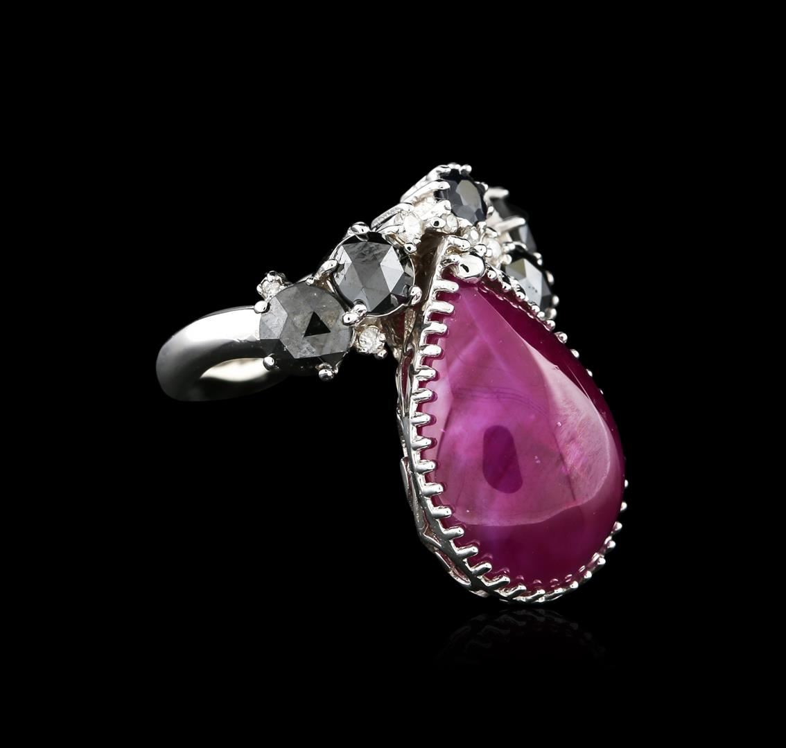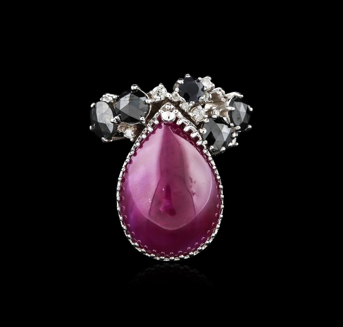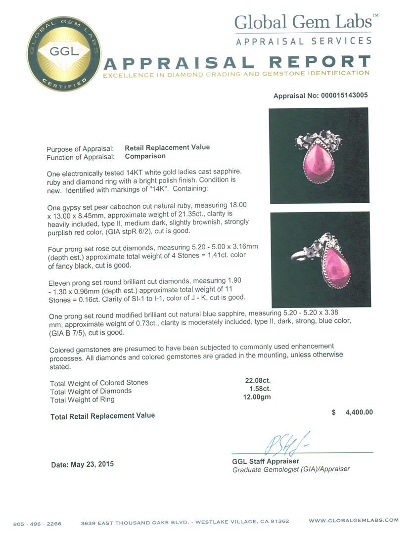 One electronically tested 14KT white gold ladies cast sapphire, ruby and diamond ring with a bright polish finish. Identified with markings of "14K". Condition is new. Containing: One gypsy set pear cabochon cut natural ruby, measuring 18.00 x 13.00 x 8.45mm, approximate weight of 21.35ct., clarity is heavily included, type II, medium dark, slightly brownish, strongly purplish red color, (GIA stpR 6/2), cut is good. Four prong set rose cut diamonds, measuring 5.20 - 5.00 x 3.16mm (depth est.) approximate total weight of 4 Stones = 1.41ct. color of fancy black, cut is good. Eleven prong set round brilliant cut diamonds, measuring 1.90 - 1.30 x 0.96mm (depth est.) approximate total weight of 11 Stones = 0.16ct. Clarity: SI-1 to I-1. Color: J - K, Cut is Good. One prong set round modified brilliant cut natural blue sapphire, measuring 5.20 - 5.20 x 3.38 mm, approximate weight of 0.73ct., clarity is moderately included, type II, dark, strong, blue color, (GIA B 7/5), cut is good. Colored gemstones are presumed to have been subjected to commonly used enhancement processes. All diamonds and colored gemstones are graded in the mounting, unless otherwise stated. Total Weight of Colored Stones 22.08ct. Total Weight of Diamonds 1.58ct. Total Weight of Ring 12.00 grams. GGL Appraised at $4,400.00.
