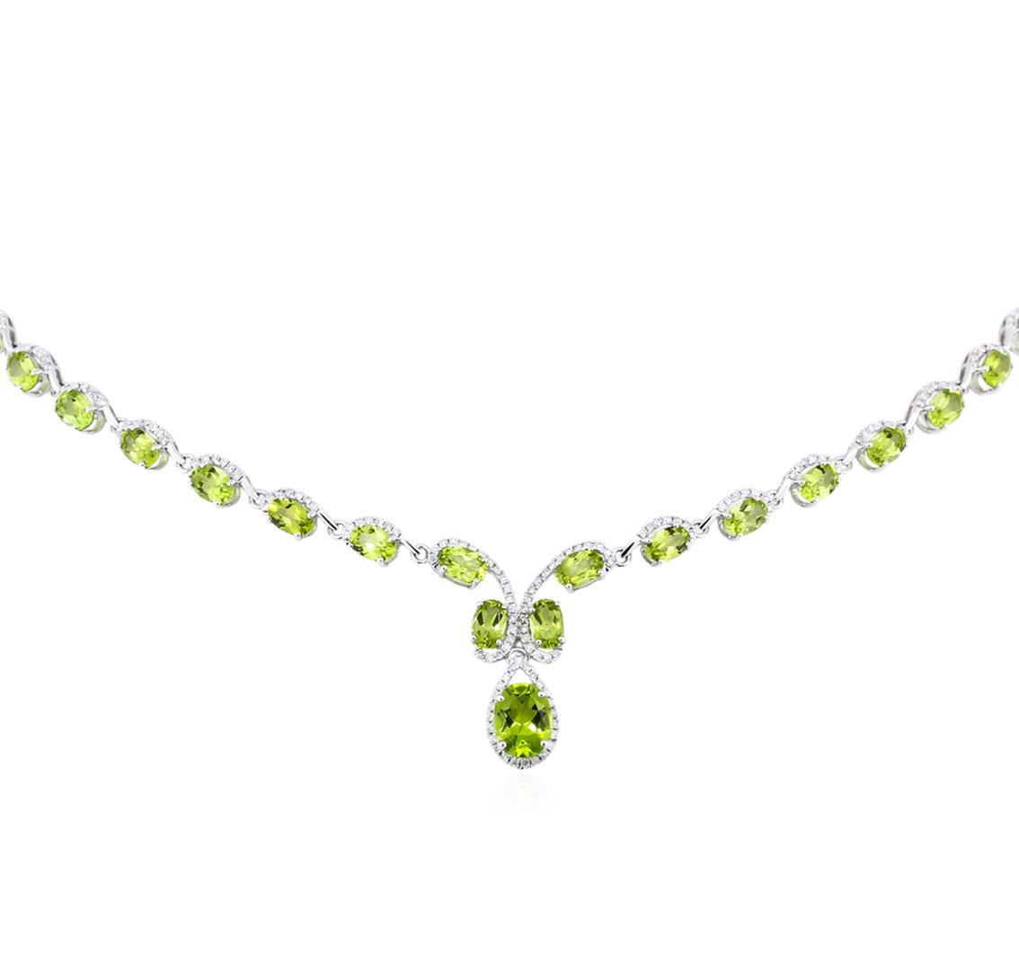 One peridot and diamond necklace featuring 22.00 grams of 14KT white gold. Forty-three oval shaped peridot gemstones totaling 21.61 carats are accented by 2.20 carats of round diamonds for an elegant finish that is top notch. Great craftsmanship and design.