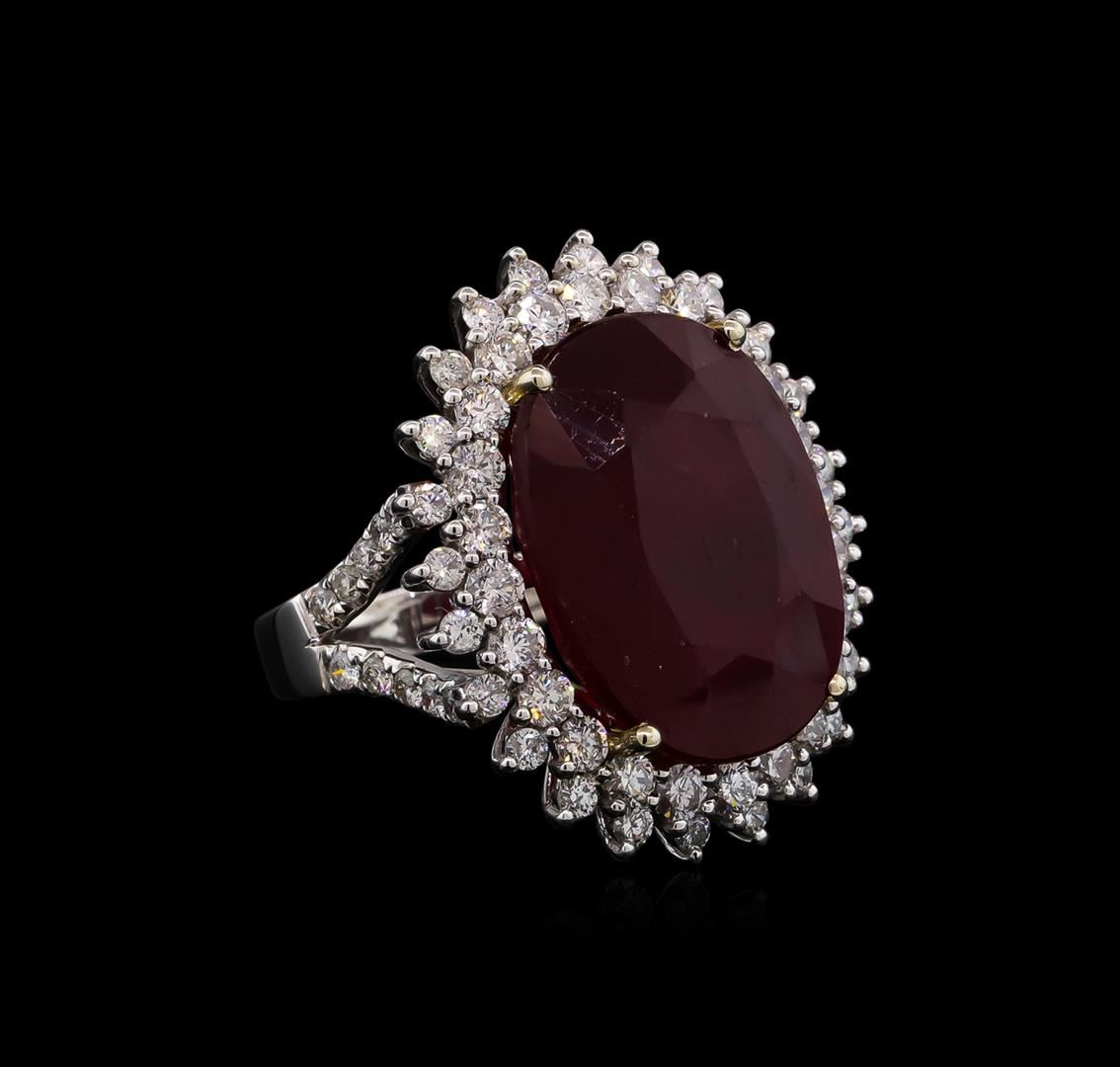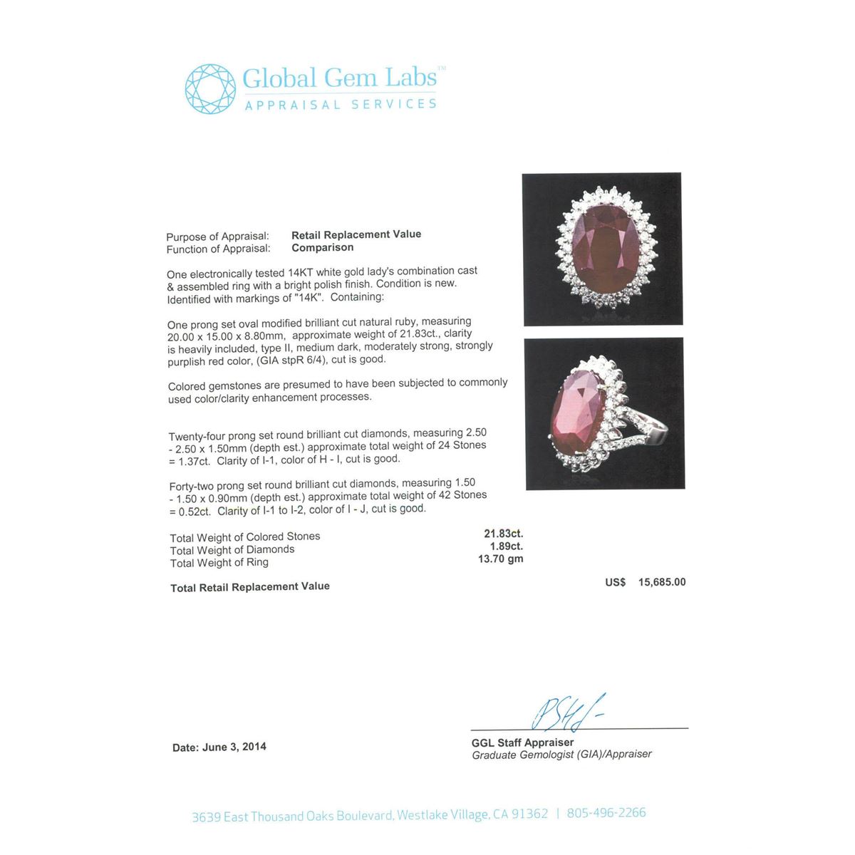 One electronically tested 14KT white gold Ladies combination cast & assembled ring with a bright polish finish. Condition is new. Identified with markings of "14K". Containing: One prong set oval modified brilliant cut natural ruby, measuring 20.00 x 15.00 x 8.80mm, approximate weight of 21.83ct., clarity is heavily included, type II, medium dark, moderately strong, strongly purplish red color, (GIA stpR 6/4), cut is good. Colored gemstones are presumed to have been subjected to commonly used color/clarity enhancement processes. Twenty-Four prong set round brilliant cut diamonds, measuring 2.50 - 2.50 x 1.50mm (depth est.) approximate. Total Weight of 24 Stones = 1.37ct. Clarity: I-1. Color: H - I, Cut is Good. Forty-Two prong set round brilliant cut diamonds, measuring 1.50 - 1.50 x 0.90mm (depth est.) approximate. Total Weight of 42 Stones = 0.52ct. Clarity: I-1 to I-2. Color: I - J, Cut is Good. Total Weight of Colored Stones 21.83ct. Total Weight of Diamonds 1.89ct. Total Weight of Ring 13.70 grams. GGL Appraised at $15,685.00.