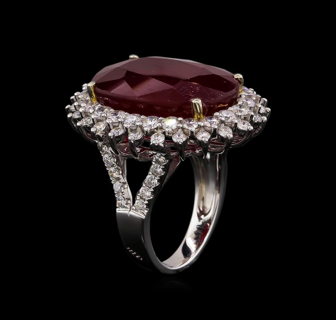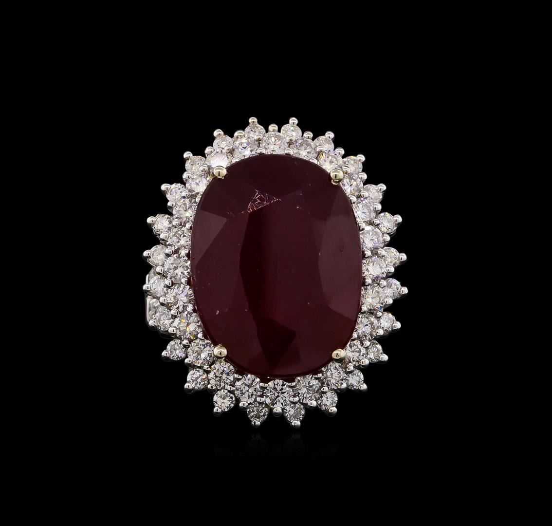 One electronically tested 14KT white gold Ladies combination cast & assembled ring with a bright polish finish. Condition is new. Identified with markings of "14K". Containing: One prong set oval modified brilliant cut natural ruby, measuring 20.00 x 15.00 x 8.80mm, approximate weight of 21.83ct., clarity is heavily included, type II, medium dark, moderately strong, strongly purplish red color, (GIA stpR 6/4), cut is good. Colored gemstones are presumed to have been subjected to commonly used color/clarity enhancement processes. Twenty-Four prong set round brilliant cut diamonds, measuring 2.50 - 2.50 x 1.50mm (depth est.) approximate. Total Weight of 24 Stones = 1.37ct. Clarity: I-1. Color: H - I, Cut is Good. Forty-Two prong set round brilliant cut diamonds, measuring 1.50 - 1.50 x 0.90mm (depth est.) approximate. Total Weight of 42 Stones = 0.52ct. Clarity: I-1 to I-2. Color: I - J, Cut is Good. Total Weight of Colored Stones 21.83ct. Total Weight of Diamonds 1.89ct. Total Weight of Ring 13.70 grams. GGL Appraised at $15,685.00.