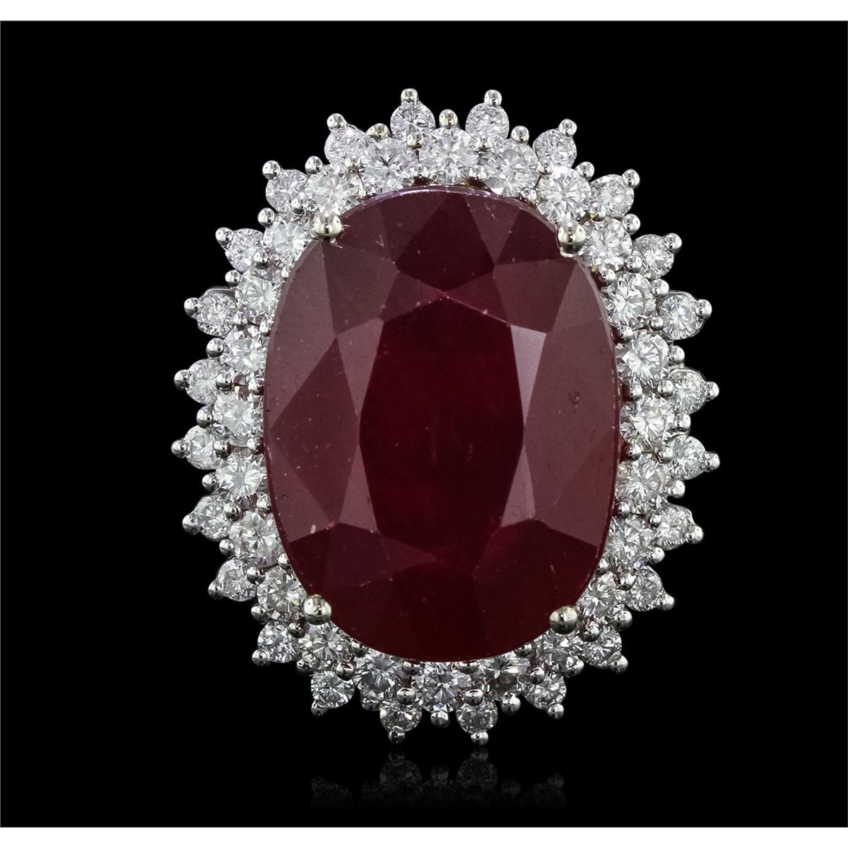 One electronically tested 14KT white gold Ladies combination cast & assembled ring with a bright polish finish. Condition is new. Identified with markings of "14K". Containing: One prong set oval modified brilliant cut natural ruby, measuring 20.00 x 15.00 x 8.80mm, approximate weight of 21.83ct., clarity is heavily included, type II, medium dark, moderately strong, strongly purplish red color, (GIA stpR 6/4), cut is good. Colored gemstones are presumed to have been subjected to commonly used color/clarity enhancement processes. Twenty-Four prong set round brilliant cut diamonds, measuring 2.50 - 2.50 x 1.50mm (depth est.) approximate. Total Weight of 24 Stones = 1.37ct. Clarity: I-1. Color: H - I, Cut is Good. Forty-Two prong set round brilliant cut diamonds, measuring 1.50 - 1.50 x 0.90mm (depth est.) approximate. Total Weight of 42 Stones = 0.52ct. Clarity: I-1 to I-2. Color: I - J, Cut is Good. Total Weight of Colored Stones 21.83ct. Total Weight of Diamonds 1.89ct. Total Weight of Ring 13.70 grams. GGL Appraised at $15,685.00.