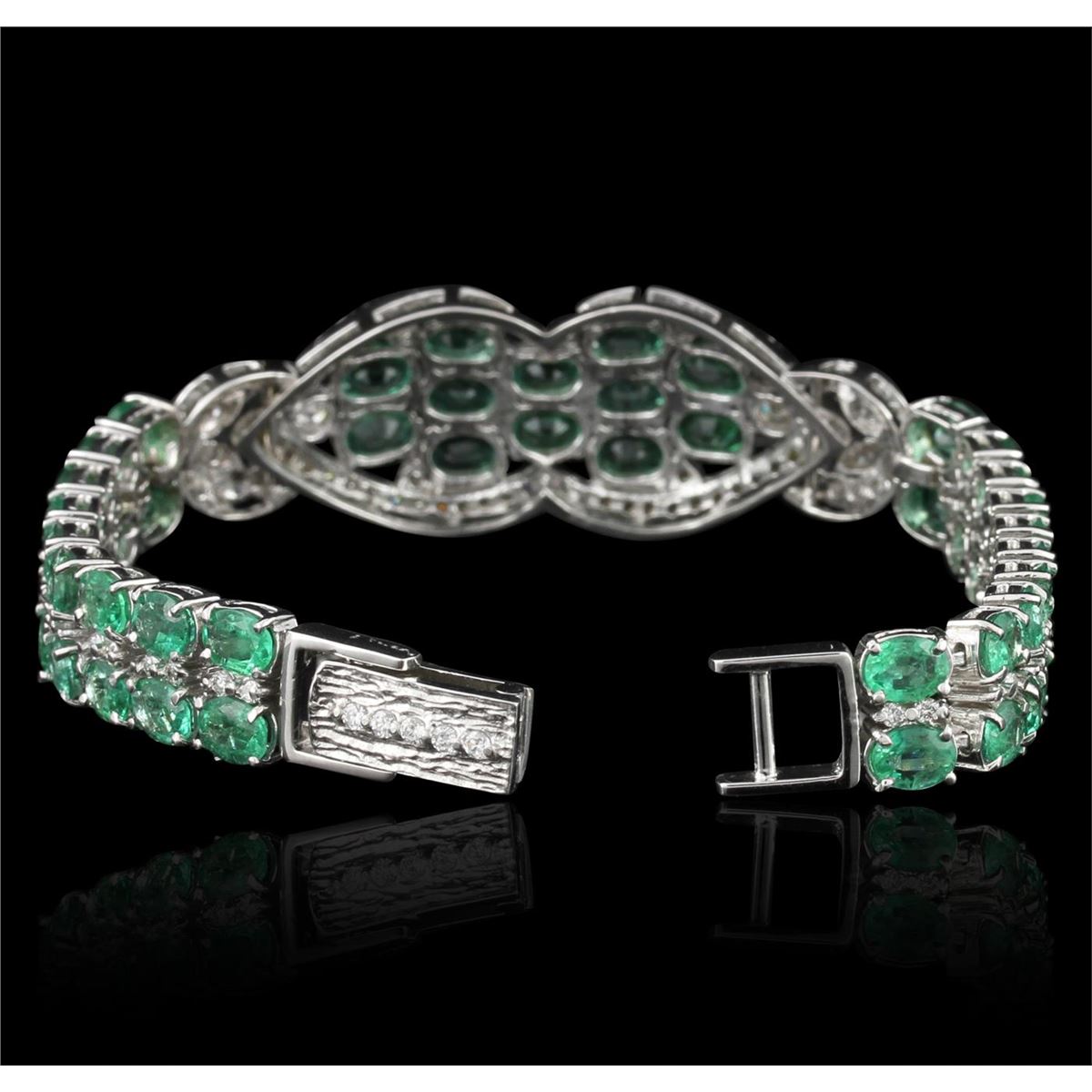 One electronically tested 14KT white gold ladies cast & assembled emerald and diamond bracelet with a bright polish finish. Condition is new, good workmanship. The seven inch length bracelet features an emerald and diamond ornament supported by a ribbon of emerald and diamonds, terminating in a fold over locking clasp. Identified with markings of "K14". Containing: Fifty prong set oval mixed cut natural emeralds, measuring 5.00 x 4.00 x 2.80mm, 8% bulge factor, approximate total weight of 22.00ct., clarity is heavily included, type III, medium, very slightly grayish, very slightly bluish green color, (GIA vslbG 5/3), cut is good. Transmitting light with a minimum of distortion, transparent. Naturally occurring internal & external characteristics are present. Indications of oil, & opticon residue. Measurements & the color grade are an average for the group. Graded in the setting. One hundred thirty-one prong set round brilliant cut diamonds, measuring 3.00 - 1.60 x 1.38mm (depth est.) approximate total weight of 131 Stones = 3.00ct. Graded in the setting. Clarity SI-1 to I- 1. Color F -- H. Total Weight of Colored Stones 22.00ct. Total Weight of Diamonds 3.00ct. Total Weight of Bracelet 27.80gm. AIG Appraised at $29,900.00.
