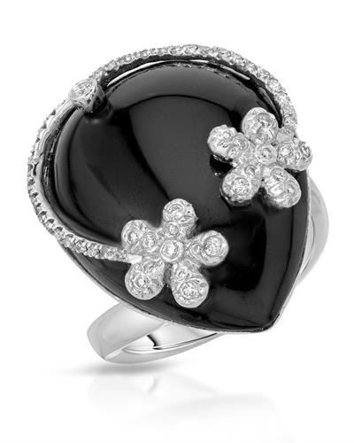 One 14KT White Gold 22.27ct Onyx and Diamond Ring. (1) Black Onyx stone with a total weight of 22.27cts. (58) Round Diamonds with a total weight of 0.33cts with a color of I and clarity of I-1. Total weight of this ring is 6.56 grams.