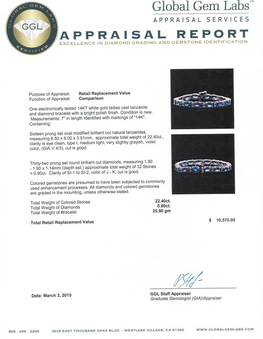 One electronically tested 14KT white gold ladies cast tanzanite and diamond bracelet with a bright polish finish. Measurements: 7" in length Identified with markings of "14K". Condition is new. Containing: Sixteen prong set oval modified brilliant cut natural tanzanites, measuring 8.50 x 6.00 x 3.91mm, approximate total weight of 22.40ct., clarity is eye clean, type I, medium light, very slightly grayish, violet color, (GIA V 4/3), cut is good. Thirty-Two prong set round brilliant cut diamonds, measuring 1.90 - 1.90 x 1.14mm (depth est.) approximate total weight of 32 Stones = 0.80ct. Clarity: SI-1 to SI-2. Color: J - K, Cut is Good. Colored gemstones are presumed to have been subjected to commonly used enhancement processes. All diamonds and colored gemstones are graded in the mounting, unless otherwise stated. Total Weight of Colored Stones 22.40ct. Total Weight of Diamonds 0.80ct. Total Weight of Bracelet 20.90 grams. GGL Appraised at $10,570.00.
