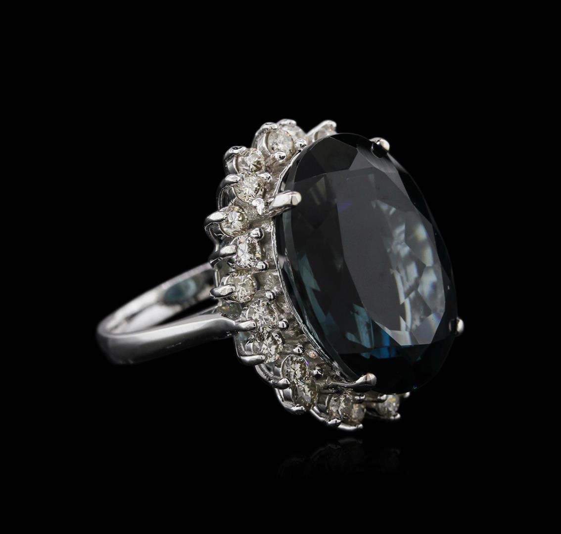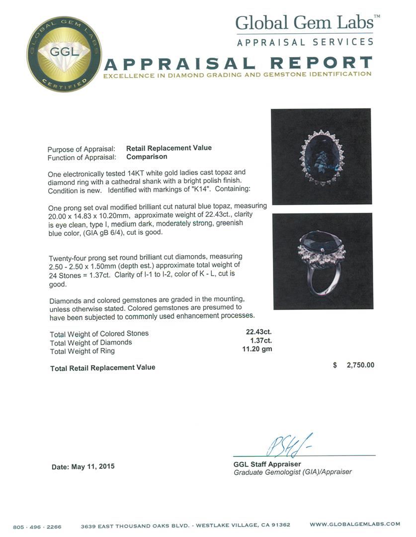 One electronically tested 14KT white gold ladies cast topaz and diamond ring with a cathedral shank with a bright polish finish. Identified with markings of "K14". Condition is new. Containing: One prong set oval modified brilliant cut natural blue topaz, measuring 20.00 x 14.83 x 10.20mm, approximate weight of 22.43ct., clarity is eye clean, type I, medium dark, moderately strong, greenish blue color, (GIA gB 6/4), cut is good. Twenty-Four prong set round brilliant cut diamonds, measuring 2.50 - 2.50 x 1.50mm (depth est.) approximate total weight of 24 Stones = 1.37ct. Clarity: I-1 to I-2. Color: K - L, Cut is Good. Diamonds and colored gemstones are graded in the mounting, unless otherwise stated. Colored gemstones are presumed to have been subjected to commonly used enhancement processes. Total Weight of Colored Stones 22.43ct. Total Weight of Diamonds 1.37ct. Total Weight of Ring 11.20 grams. GGL Appraised at $2,750.00.