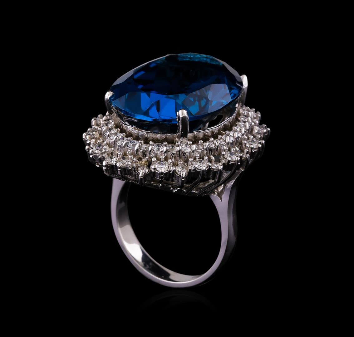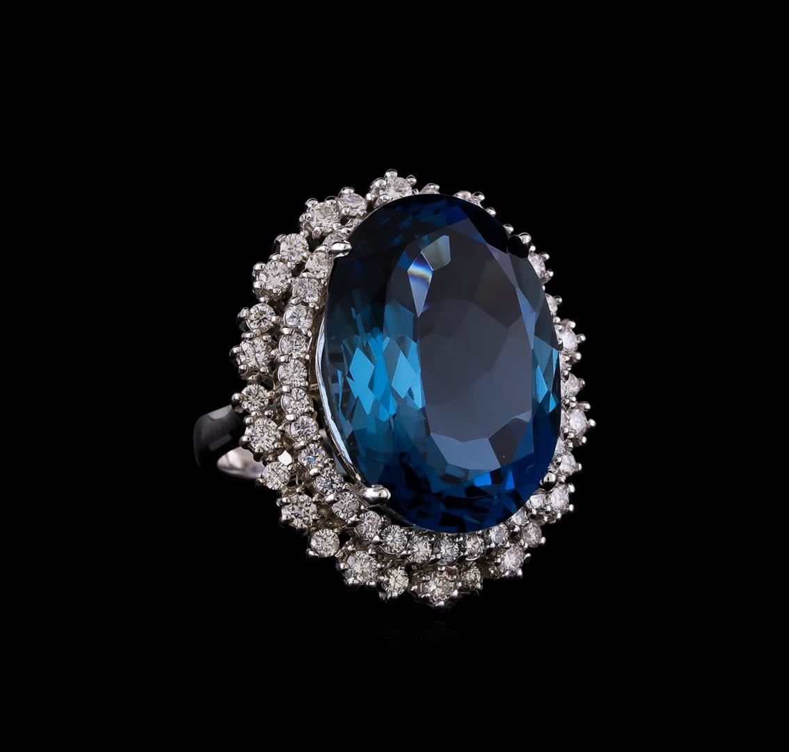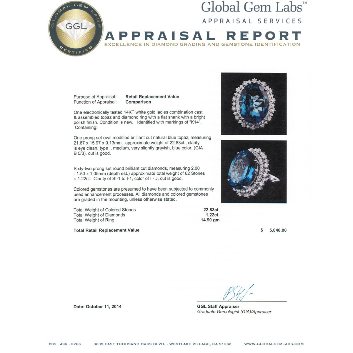 One electronically tested 14KT white gold ladies combination cast & assembled topaz and diamond ring with a flat shank with a bright polish finish. Identified with markings of "K14". Condition is new. Containing: One prong set oval modified brilliant cut natural blue topaz, measuring 21.67 x 15.97 x 9.13mm, approximate weight of 22.83ct., clarity is eye clean, type I, medium, very slightly grayish, blue color, (GIA B 5/3), cut is good. Sixty-Two prong set round brilliant cut diamonds, measuring 2.00 - 1.50 x 1.05mm (depth est.) approximate total weight of 62 Stones = 1.22ct. Clarity: SI-1 to I-1. Color: I - J, Cut is Good. Colored gemstones are presumed to have been subjected to commonly used enhancement processes. All diamonds and colored gemstones are graded in the mounting, unless otherwise stated. Total Weight of Colored Stones 22.83ct. Total Weight of Diamonds 1.22ct. Total Weight of Ring 14.90 grams. GGL Appraised at $5,040.00.
