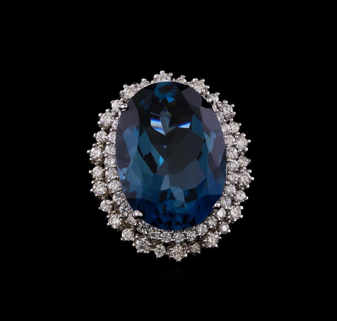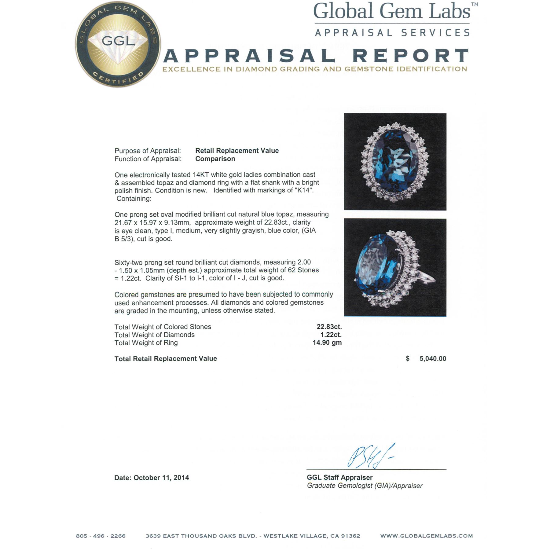 One electronically tested 14KT white gold ladies combination cast & assembled topaz and diamond ring with a flat shank with a bright polish finish. Identified with markings of "K14". Condition is new. Containing: One prong set oval modified brilliant cut natural blue topaz, measuring 21.67 x 15.97 x 9.13mm, approximate weight of 22.83ct., clarity is eye clean, type I, medium, very slightly grayish, blue color, (GIA B 5/3), cut is good. Sixty-Two prong set round brilliant cut diamonds, measuring 2.00 - 1.50 x 1.05mm (depth est.) approximate total weight of 62 Stones = 1.22ct. Clarity: SI-1 to I-1. Color: I - J, Cut is Good. Colored gemstones are presumed to have been subjected to commonly used enhancement processes. All diamonds and colored gemstones are graded in the mounting, unless otherwise stated. Total Weight of Colored Stones 22.83ct. Total Weight of Diamonds 1.22ct. Total Weight of Ring 14.90 grams. GGL Appraised.