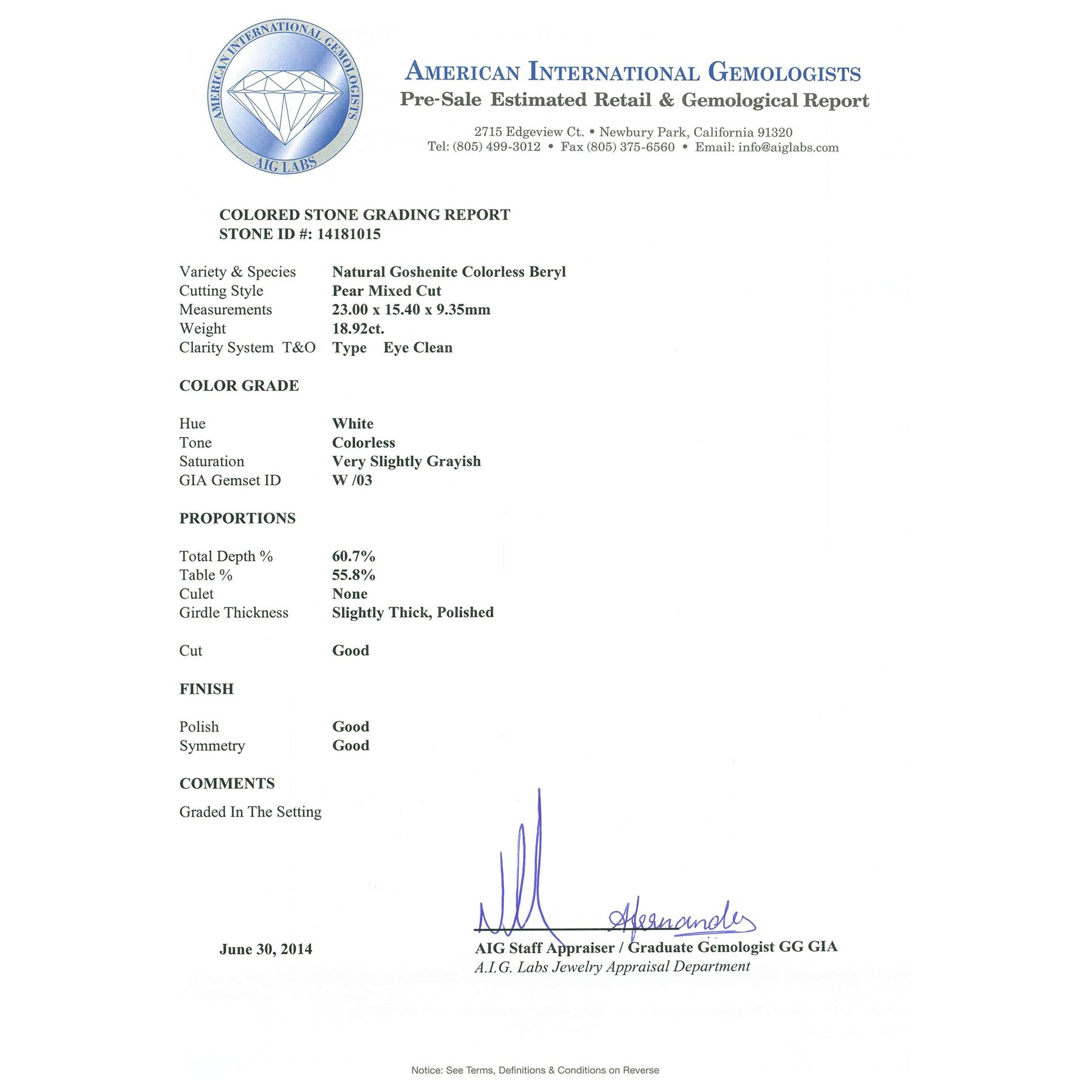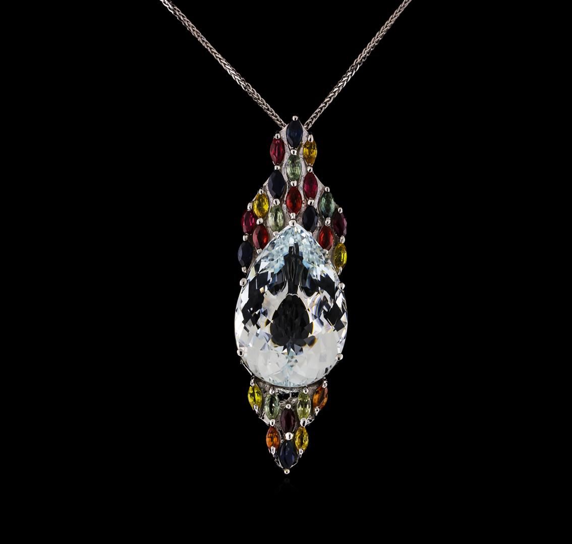 One electronically tested 14KT white gold ladies cast & assembled multi-gemstone pendant with chain. Condition is new, good workmanship. The pendant features a beryl set within a multi-gemstone bezel, and matching bail. The pendant is supported by an eighteen inch length 14KT white gold designer style chain terminating in a lobster claw clasp. Bright polish finish. Identified with markings of "14K". Containing: One prong set pear mixed cut natural goshenite colorless beryl, measuring 23.00 x 15.40 x 9.35mm, 5%. bulge factor, approximate weight of 18.92ct., clarity is eye clean, colorless, very slightly grayish, white color, (GIA W 0/3), cut is good. Transmitting light with no distortion, transparent. Refractive index testing results of 1.57 to 1.58. This is a conclusive result for Beryl. Graded in the setting. Twenty-five prong set marquise mixed cut natural multi-color sapphire & rubies, measuring 4.20 x 2.20 x 1.43mm, approximate. Total Weight of 2.35ct., clarity is slightly included, cut is good. Transmitting light with a minimum of distortion, transparent. The group includes a mix of natural blue, green, yellow, orange and colorless sapphires and rubies Measurements are an average for the group. Graded in the setting. Total Weight of Colored Stones 21.27ct. Total Weight of Pendant With Chain 12.80 grams. AIG Appraised at $10,900.00.