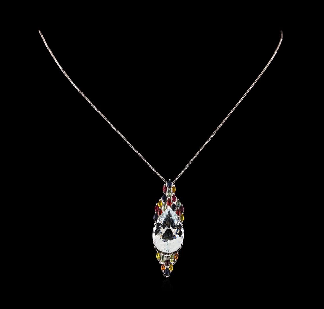 One electronically tested 14KT white gold ladies cast & assembled multi-gemstone pendant with chain. Condition is new, good workmanship. The pendant features a beryl set within a multi-gemstone bezel, and matching bail. The pendant is supported by an eighteen inch length 14KT white gold designer style chain terminating in a lobster claw clasp. Bright polish finish. Identified with markings of "14K". Containing: One prong set pear mixed cut natural goshenite colorless beryl, measuring 23.00 x 15.40 x 9.35mm, 5%. bulge factor, approximate weight of 18.92ct., clarity is eye clean, colorless, very slightly grayish, white color, (GIA W 0/3), cut is good. Transmitting light with no distortion, transparent. Refractive index testing results of 1.57 to 1.58. This is a conclusive result for Beryl. Graded in the setting. Twenty-five prong set marquise mixed cut natural multi-color sapphire & rubies, measuring 4.20 x 2.20 x 1.43mm, approximate. Total Weight of 2.35ct., clarity is slightly included, cut is good. Transmitting light with a minimum of distortion, transparent. The group includes a mix of natural blue, green, yellow, orange and colorless sapphires and rubies Measurements are an average for the group. Graded in the setting. Total Weight of Colored Stones 21.27ct. Total Weight of Pendant With Chain 12.80 grams. AIG Appraised at $10,900.00.