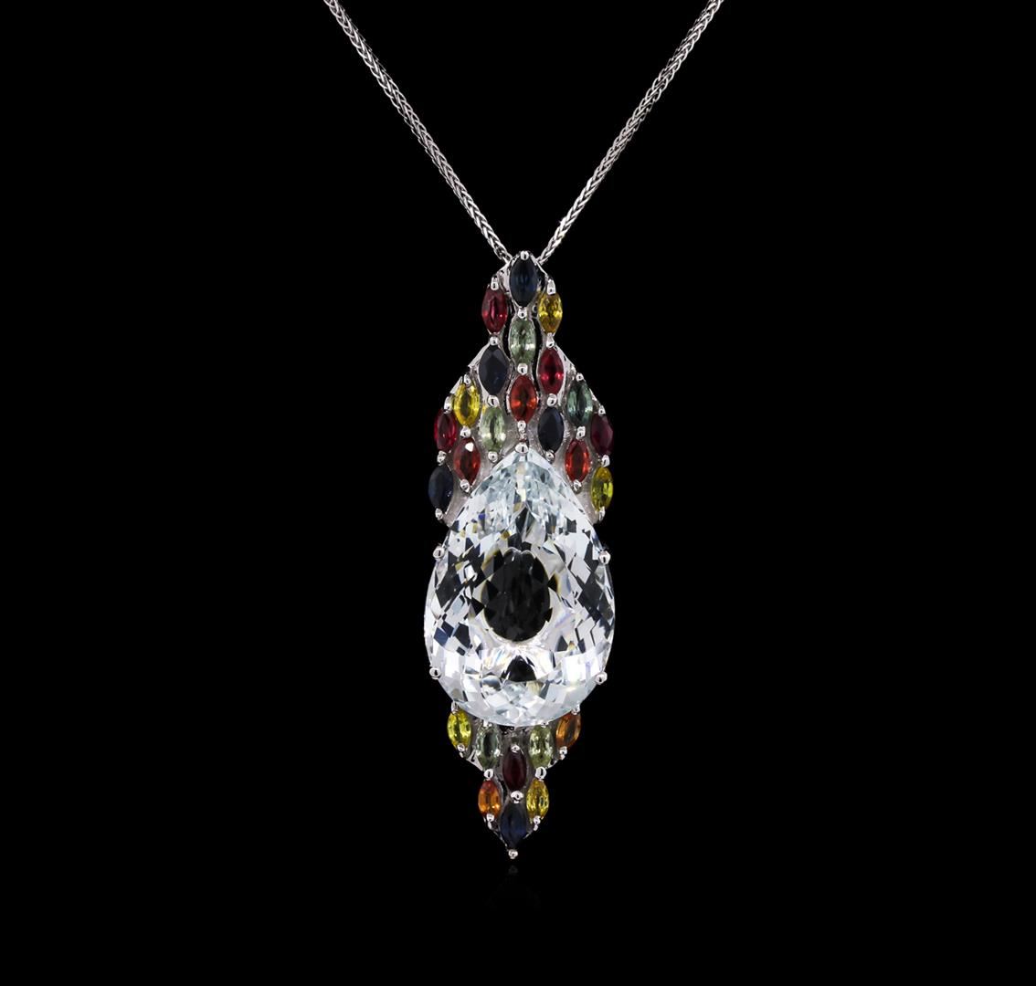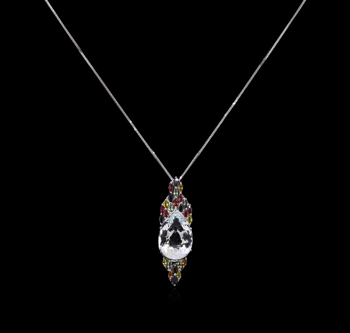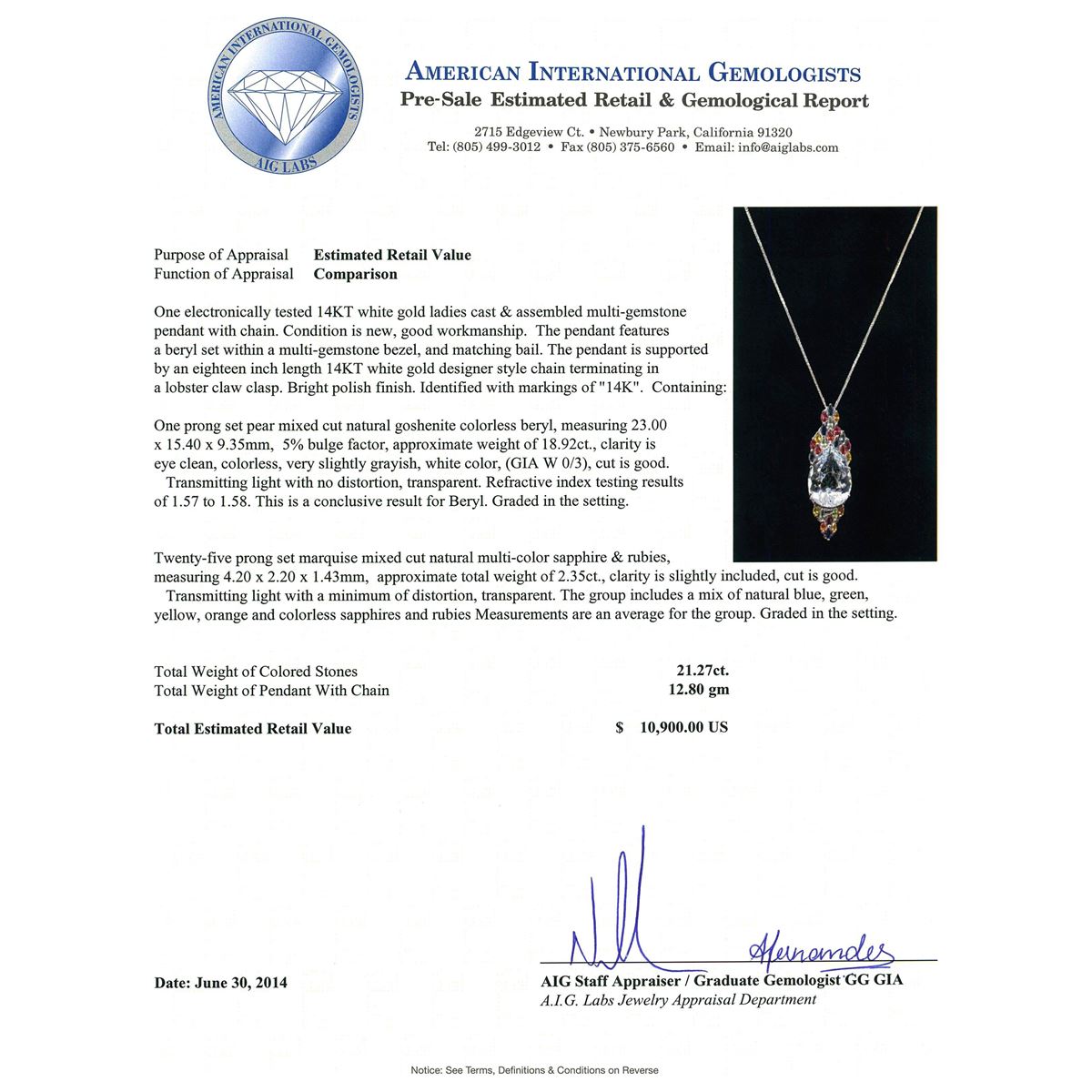 One electronically tested 14KT white gold ladies cast & assembled multi-gemstone pendant with chain. Condition is new, good workmanship. The pendant features a beryl set within a multi-gemstone bezel, and matching bail. The pendant is supported by an eighteen inch length 14KT white gold designer style chain terminating in a lobster claw clasp. Bright polish finish. Identified with markings of "14K". Containing: One prong set pear mixed cut natural goshenite colorless beryl, measuring 23.00 x 15.40 x 9.35mm, 5%. bulge factor, approximate weight of 18.92ct., clarity is eye clean, colorless, very slightly grayish, white color, (GIA W 0/3), cut is good. Transmitting light with no distortion, transparent. Refractive index testing results of 1.57 to 1.58. This is a conclusive result for Beryl. Graded in the setting. Twenty-five prong set marquise mixed cut natural multi-color sapphire & rubies, measuring 4.20 x 2.20 x 1.43mm, approximate. Total Weight of 2.35ct., clarity is slightly included, cut is good. Transmitting light with a minimum of distortion, transparent. The group includes a mix of natural blue, green, yellow, orange and colorless sapphires and rubies Measurements are an average for the group. Graded in the setting. Total Weight of Colored Stones 21.27ct. Total Weight of Pendant With Chain 12.80 grams. AIG Appraised at $10,900.00.