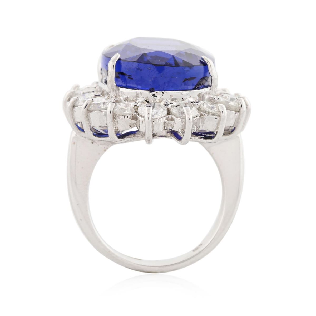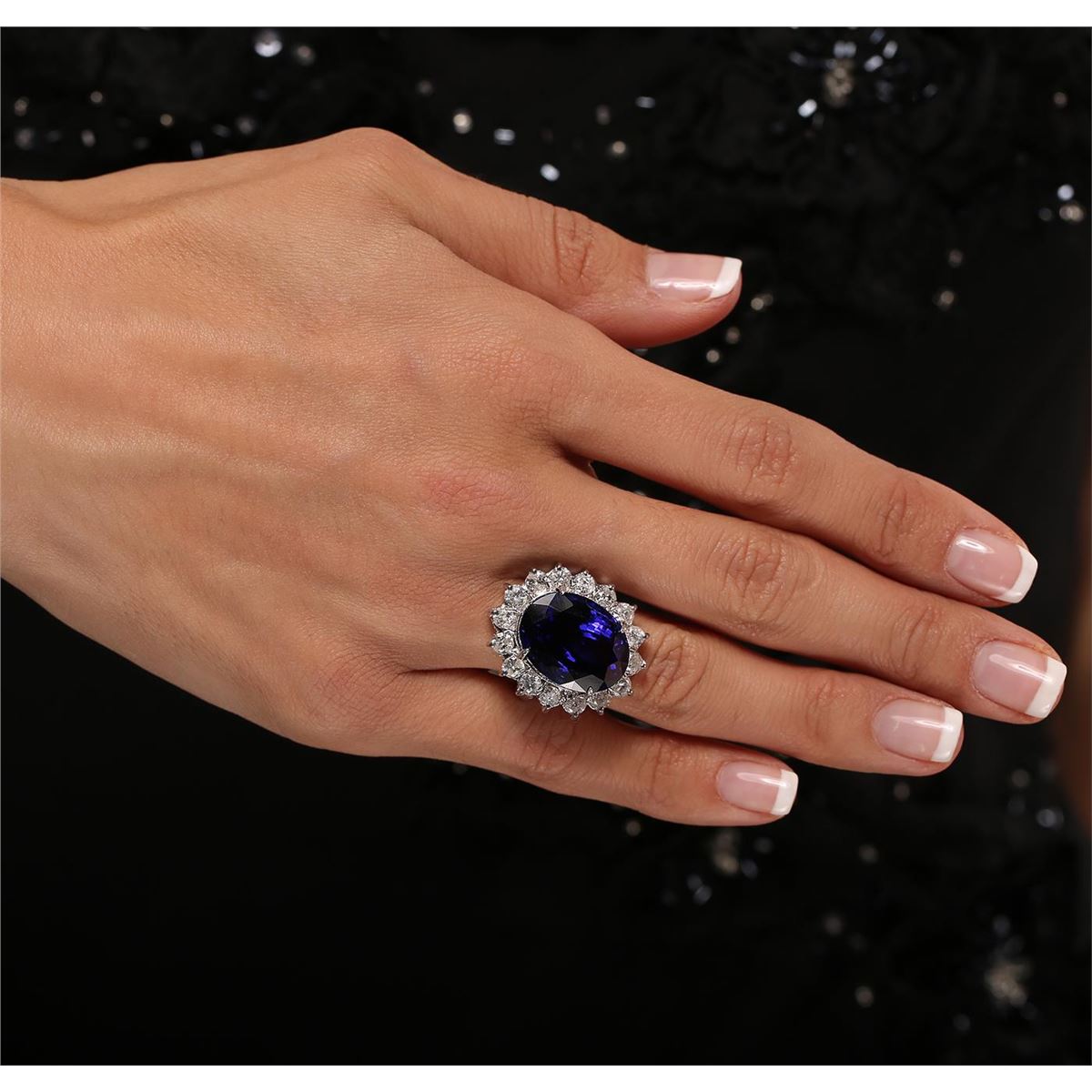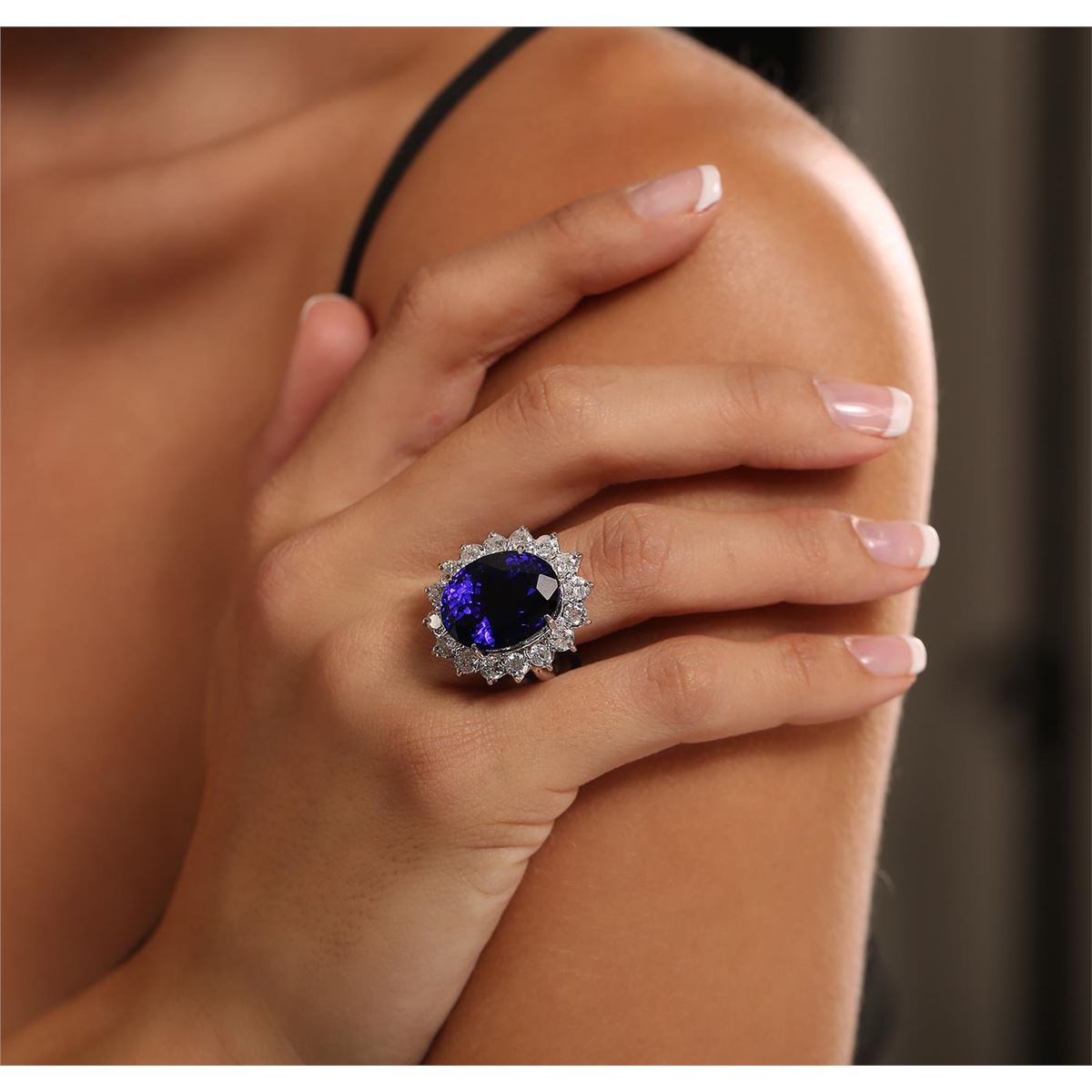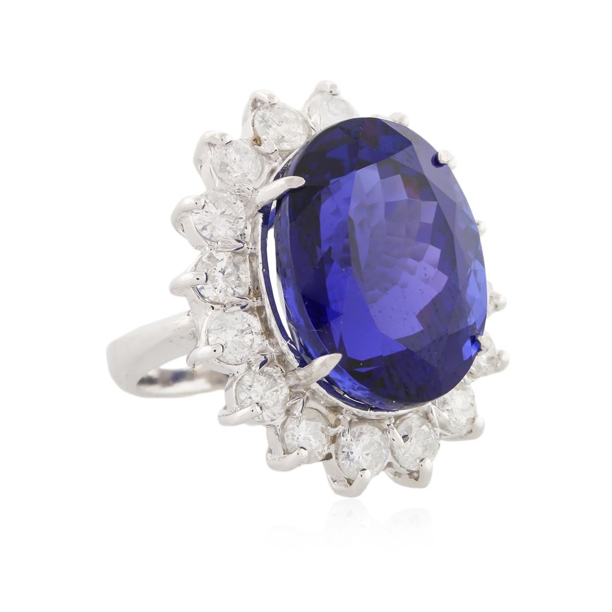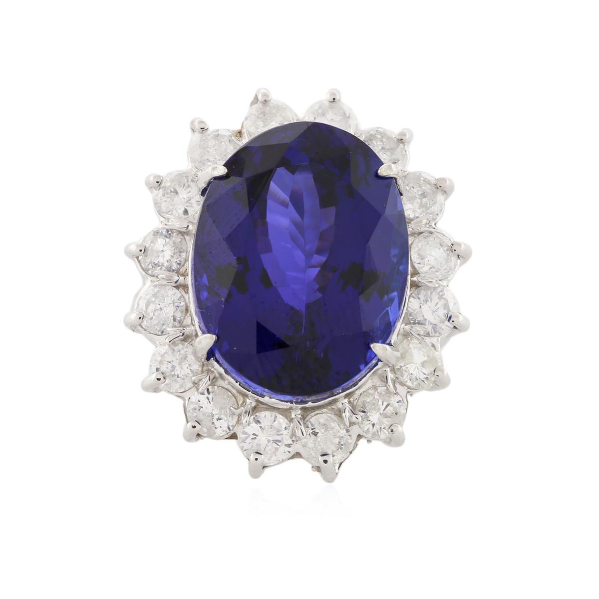 One electronically tested 14KT white gold ladies cast tanzanite and diamond ring with a bright polish finish. Condition is new, good workmanship. The featured tanzanite is set within a diamond bezel supported by tapering shoulders, completed by a four and one-half millimeter wide band. Identified with markings of "K14". Containing: One prong set oval modified brilliant cut natural tanzanite, measuring 18.57 x 14.22 x 11.41mm, exact weight 23.16ct., clarity is eye clean, type I, dark, very slightly grayish, violetish blue color, (GIA vB 7/3), cut is good. Transmitting light with no distortion, transparent. GIA Colored Stone Grading Report attached. Graded loose prior to setting in the GIA Laboratory, Report #1156735113. Tanzanite is a very rare gemstone that is only found in the country of Tanzania. Originally discovered in 1967. Tiffany & Company, named the stone Tanzanite. It is found in the Usumburu Mountains that border the Umba Valley of northern Tanzania. Tanzanite occurs in gray, brown, violet, blue, reddish-purple, & green. The gem is interesting because of its exceptional pleochroism. Rotated in different directions a tanzanite will exhibit multiple changes of color. Tanzanite has a low tolerance to ultrasonic cleaning, and should not be cleaned using this method. Sixteen prong set round brilliant cut diamonds, measuring 3.50 - 3.40 x 2.07mm (depth est.) approximate total weight of 16 Stones = 2.50ct. Graded in the setting. Clarity I-1 to 1-2. Color H - J. Total Weight of Colored Stones 23.16ct. Total Weight of Diamonds 2.50ct. Total Weight of Ring 14.31gm. AIG Appraised at $65,495.00.