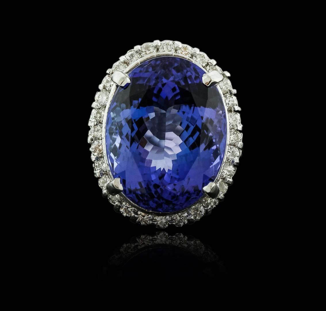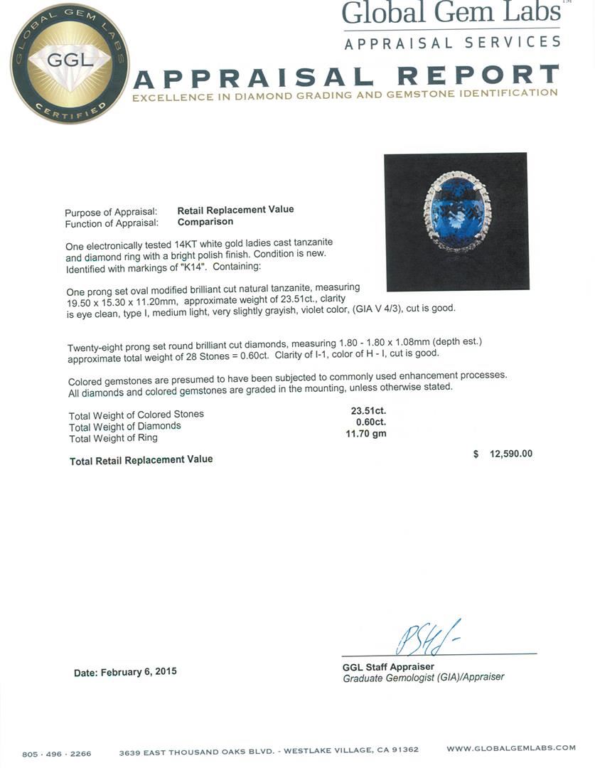 One electronically tested 14KT white gold ladies cast tanzanite and diamond ring with a bright polish finish. Identified with markings of "K14". Condition is new. Containing: One prong set oval modified brilliant cut natural tanzanite, measuring 19.50 x 15.30 x 11.20mm, approximate weight of 23.51ct., clarity is eye clean, type I, medium light, very slightly grayish, violet color, (GIA V 4/3), cut is good. Twenty-Eight prong set round brilliant cut diamonds, measuring 1.80 - 1.80 x 1.08mm (depth est.) approximate total weight of 28 Stones = 0.60ct. Clarity: I-1. Color: H - I, Cut is Good. Colored gemstones are presumed to have been subjected to commonly used enhancement processes. All diamonds and colored gemstones are graded in the mounting, unless otherwise stated. Total Weight of Colored Stones 23.51ct. Total Weight of Diamonds 0.60ct. Total Weight of Ring 11.70 grams. GGL Appraised at $12,590.00.