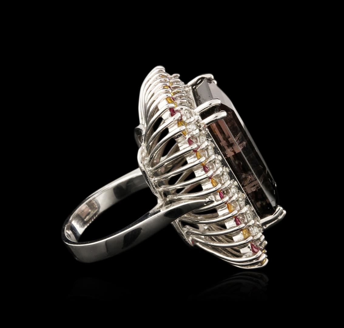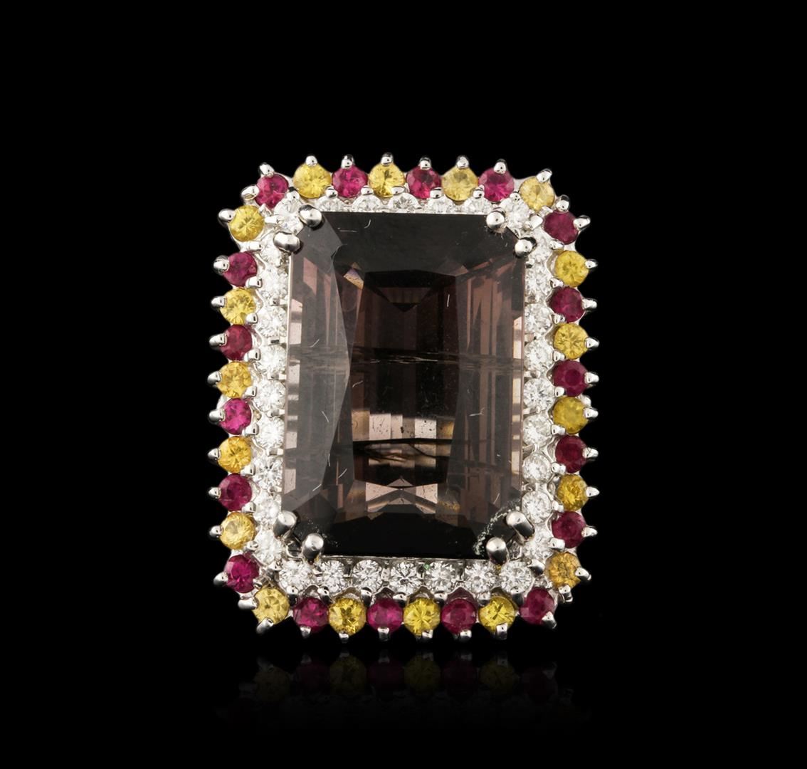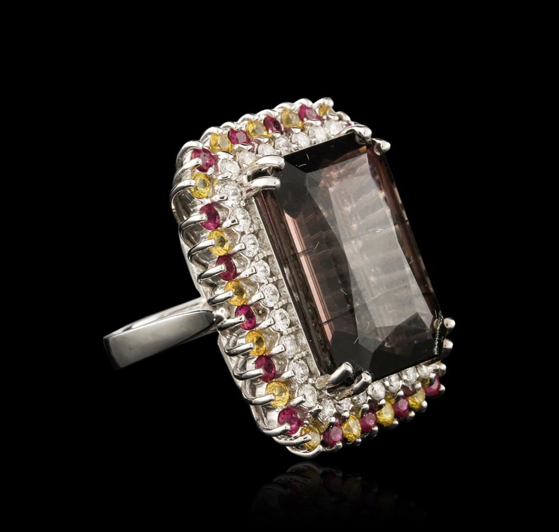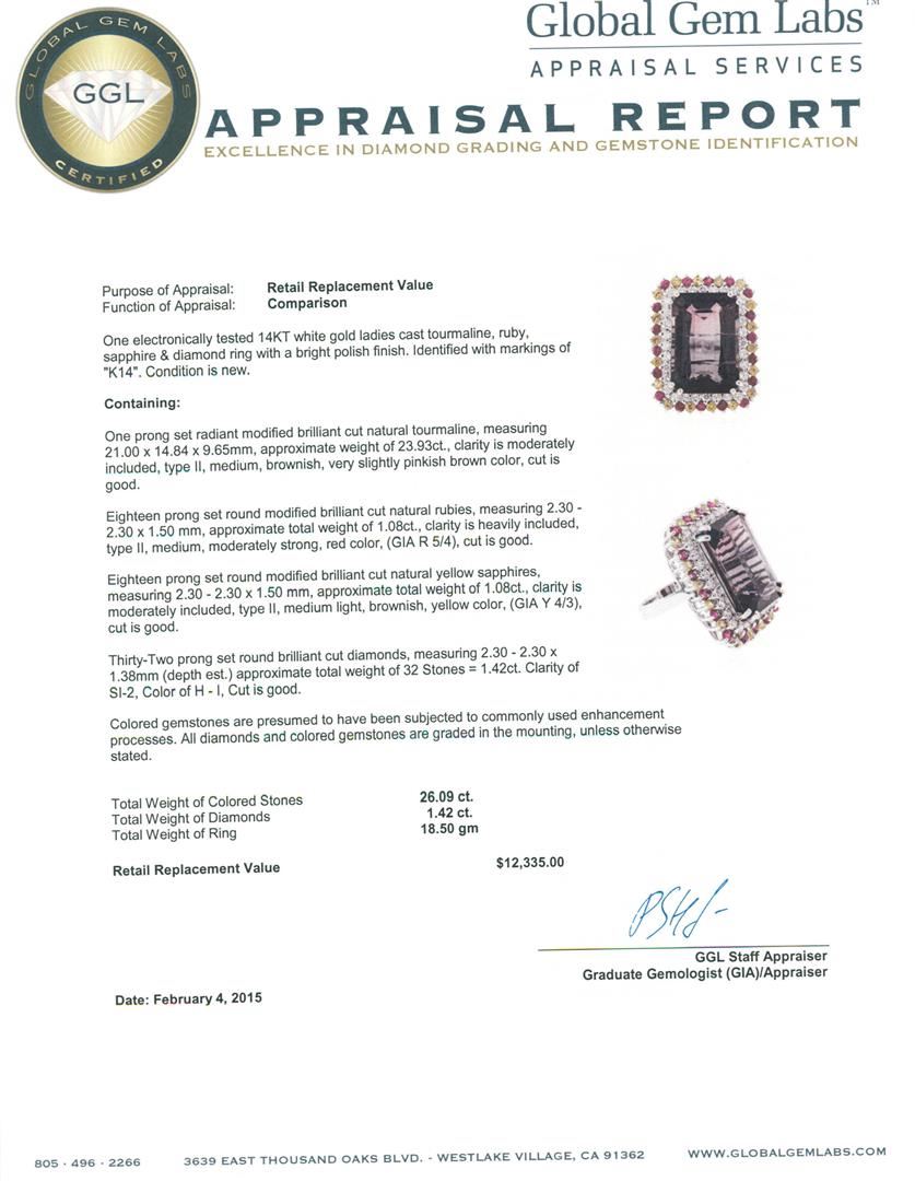 One electronically tested 14KT white gold ladies cast tourmaline, ruby, sapphire & diamond ring with a bright polish finish. Identified with markings of "K14". Condition is new. Containing: One prong set radiant modified brilliant cut natural tourmaline, measuring 21.00 x 14.84 x 9.65mm, approximate weight of 23.93ct., clarity is moderately included, type II, medium, brownish, very slightly pinkish brown color, cut is good. Eighteen prong set round modified brilliant cut natural rubies, measuring 2.30 - 2.30 x 1.50 mm, approximate total weight of 1.08ct., clarity is heavily included, type II, medium, moderately strong, red color, (GIA R 5/4), cut is good. Eighteen prong set round modified brilliant cut natural yellow sapphires, measuring 2.30 - 2.30 x 1.50 mm, approximate total weight of 1.08ct., clarity is moderately included, type II, medium light, brownish, yellow color, (GIA Y 4/3), cut is good. Thirty-Two prong set round brilliant cut diamonds, measuring 2.30 - 2.30 x 1.38mm (depth est.) approximate total weight of 32 Stones = 1.42ct. Clarity: SI-2. Color: H - I, Cut is Good. Colored gemstones are presumed to have been subjected to commonly used enhancement processes. All diamonds and colored gemstones are graded in the mounting, unless otherwise stated. Total Weight of Colored Stones 26.09ct. Total Weight of Diamonds 1.42ct. Total Weight of Ring 18.50 grams. GGL Appraised at $12,335.00.