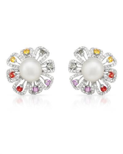 14KT White Gold 24.92ctw Pearl Sapphire and Diamond Earrings. (2) pearls with a total weight of 24.92cts. (192) Round Diamonds with a total weight of 3.13cts with a color of I and clarity of I-1. (16) multi color sapphires with a total weight of 1.75cts. Total weight of these earrings are 13.8 grams.