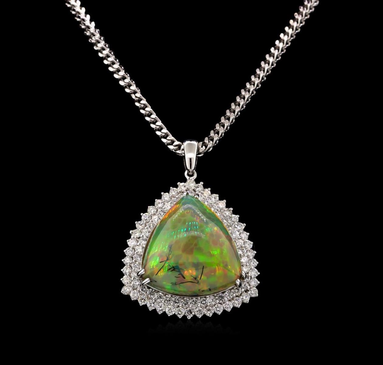 One electronically tested custom cast & assembled opal & diamond pendant with chain. The pendant features an Ethiopian opal is set in an 18KT white gold frame within a tiered diamond gallery. The pendant is supported by a 14KT white gold three millimeter designer style seventeen inch length chain. Condition is new, good workmanship. Containing: One Ethiopian opal that is cut in a triangle shaped cabochon and is prong set, measuring 24.00mm x 24.00mm x 12.00mm, the approximate weight is 25.72 carats. The opal has a quite bright, orange-green play of color (fire) in a rolling flash fire pattern; a high dome; a good cut; slightly included; slight variation in base in its brightness and pattern; and is somewhat directional. Naturally occurring internal & external characteristics are present. Graded in the setting. Eighty-Three prong set round brilliant cut diamonds, measuring 2.30 - 2.00 x 1.33mm (depth est.), 2.00% GTCF approximate total weight of 83 Stones = 3.51ct. Graded in the setting. Clarity VS-2 to SI-2. Color F -- H. Total Weight of Opal 25.72 ct. Total Weight of Diamonds 3.51 ct. Total Weight of Pendant with Chain 25.85gm. AIG Appraised.