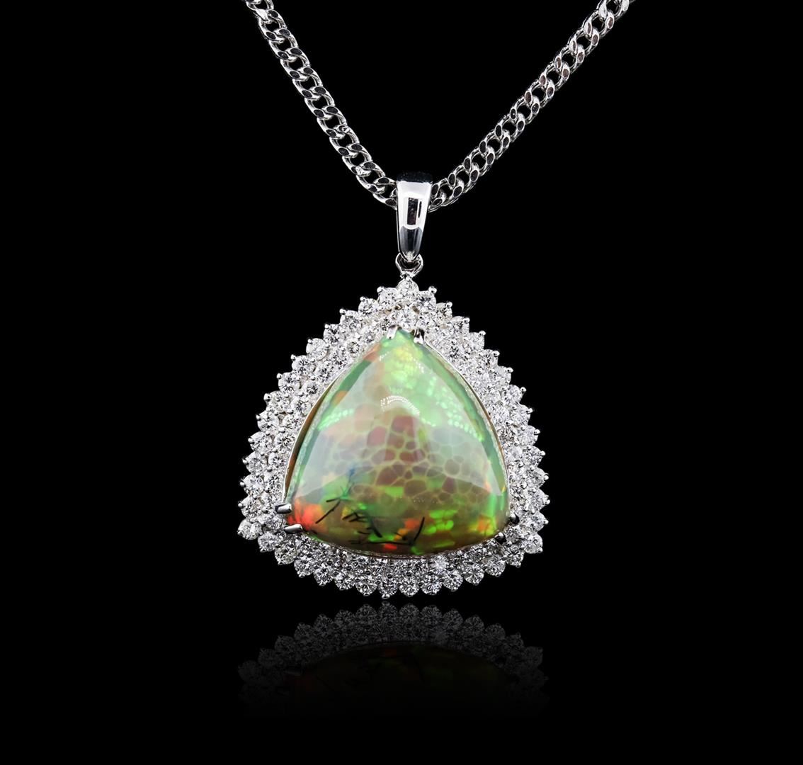 One electronically tested custom cast & assembled opal & diamond pendant with chain. The pendant features an Ethiopian opal is set in an 18KT white gold frame within a tiered diamond gallery. The pendant is supported by a 14KT white gold three millimeter designer style seventeen inch length chain. Condition is new, good workmanship. Containing: One Ethiopian opal that is cut in a triangle shaped cabochon and is prong set, measuring 24.00mm x 24.00mm x 12.00mm, the approximate weight is 25.72 carats. The opal has a quite bright, orange-green play of color (fire) in a rolling flash fire pattern; a high dome; a good cut; slightly included; slight variation in base in its brightness and pattern; and is somewhat directional. Naturally occurring internal & external characteristics are present. Graded in the setting. Eighty-Three prong set round brilliant cut diamonds, measuring 2.30 - 2.00 x 1.33mm (depth est.), 2.00% GTCF approximate total weight of 83 Stones = 3.51ct. Graded in the setting. Clarity VS-2 to SI-2. Color F -- H. Total Weight of Opal 25.72 ct. Total Weight of Diamonds 3.51 ct. Total Weight of Pendant with Chain 25.85gm. AIG Appraised at $23,300.00.