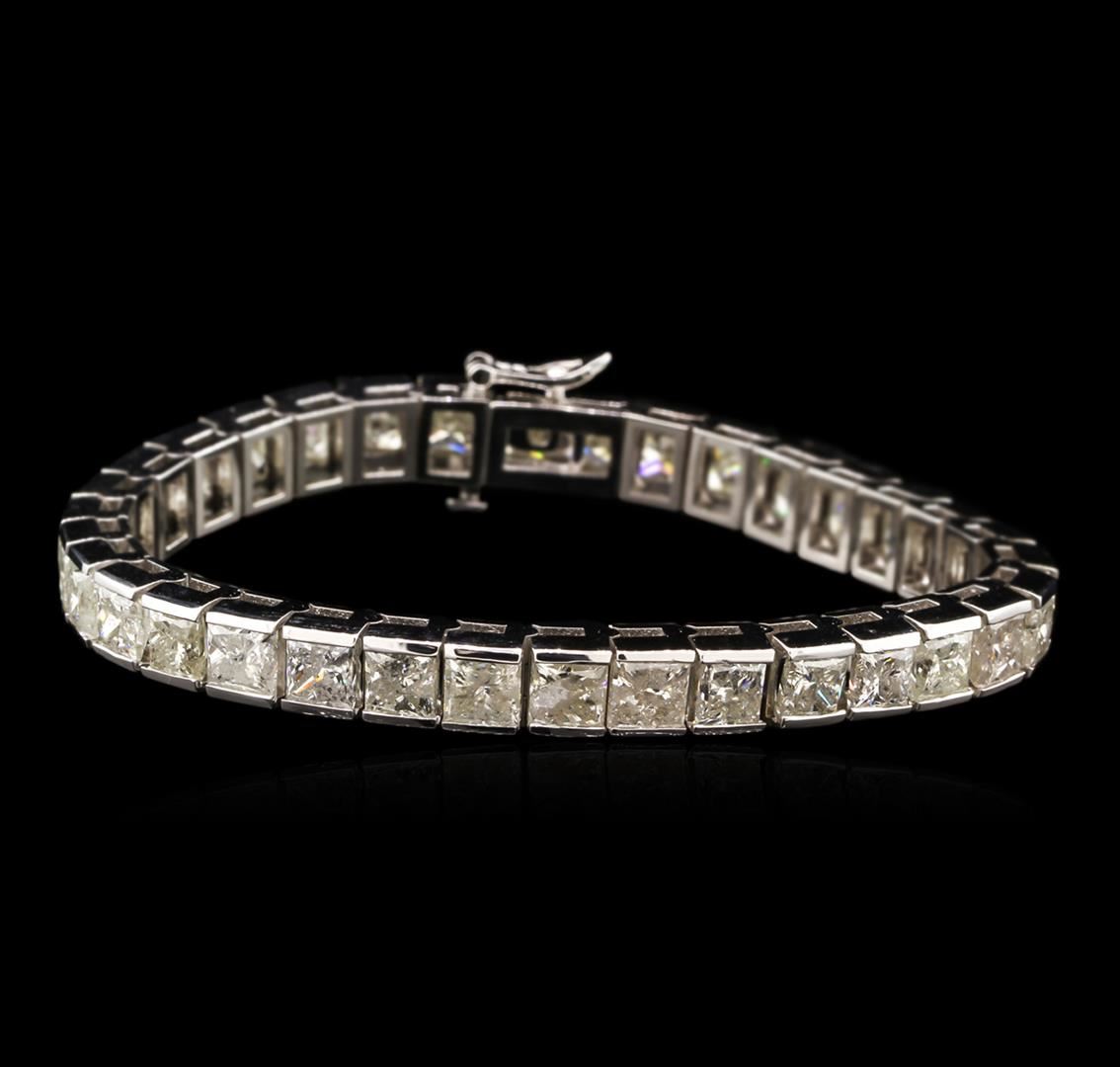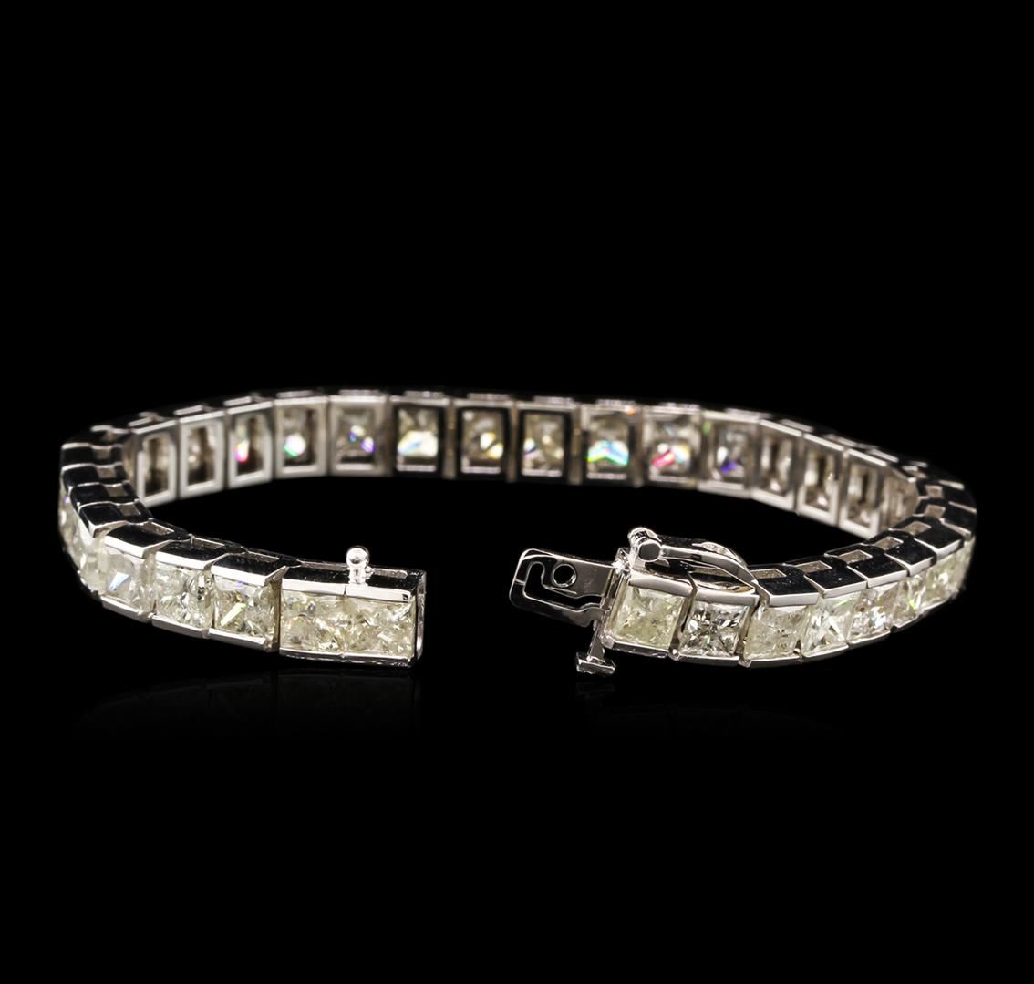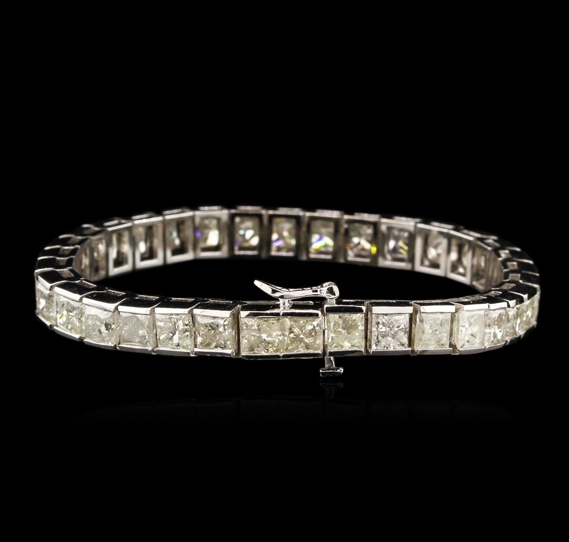 One electronically tested 14KT white gold ladies cast diamond tennis bracelet with a hidden box clasp with safety closer with a bright polish finish. 7" in length. Identified with markings of "14K". Condition is new. Containing: Thirty-Four prong set princess cut diamonds, measuring 4.50 x 4.50 x 3.38mm (depth est.) approximate total weight of 34 Stones = 26.22ct. Clarity: I-1 to I-3. Color: I - J, Cut is Good. Diamonds are graded in the mounting, unless otherwise stated. Total Weight of Diamonds 26.22ct. Total Weight of Tennis Bracelet 30.30 grams. GGL Appraised at $51,165.00.