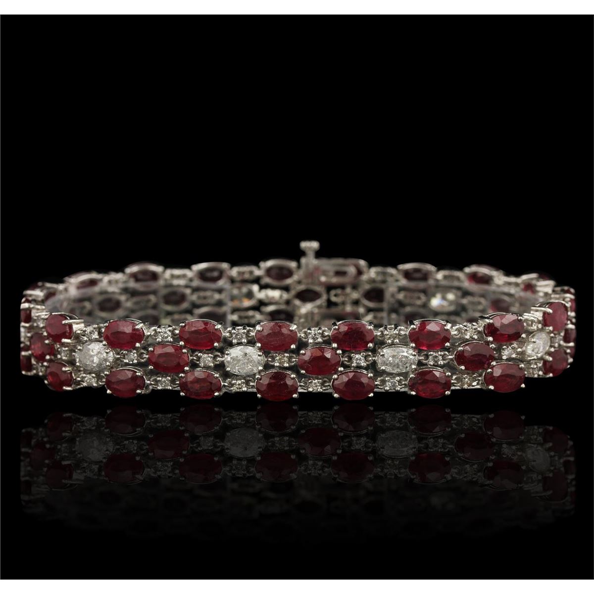 One electronically tested 14KT White Gold ladies cast & assembled ruby and diamond bracelet. Condition is Good. Eight inch length bracelet features a one-half inch wide ruby and diamond stylized series, terminating in a concealed clasp. Bright polish finish. Containing: Forty-eight prong set oval mixed cut natural rubies, measuring 6.00 x 4.00 x 2.60mm, 10%. bulge factor, approximate total weight of 27.36ct., clarity is heavily included, type II, medium dark, very slightly brownish, slightly purplish red color, (GIA slpR 6/3), cut is Good. Transmitting light somewhat diffusely, transparent to translucent. Naturally occurring internal & external characteristics are present, including surface reaching fissures. Indications of laboratory high temperature heat treatment, with glass & flux additives. Measurements & the color grade are an average for the group. Graded in the setting. Ruby has a low tolerance to rhodium plating, repolishing the surface, & ultrasonic cleaning. Nine prong set oval shaped cut diamonds, measuring 5.30 x 4.00 x 2.95mm (depth est.) approximate total weight of 9 Stones = 3.65ct. Graded in the setting. Clarity: I-1 to I-2. Color: H - J Fifty-Six prong set round brilliant cut diamonds, measuring 1.80 - 1.70 x 1.05mm (depth est.) approximate total weight of 56 Stones = 1.20ct. Graded in the setting. Clarity: SI-2 to I-2. Color: I - K. Total Weight of Colored Stones 27.36ct. Total Weight of Diamonds 4.85ct. Total Weight of Bracelet 28.14 grams. AIG Appraised at $21,180.00.