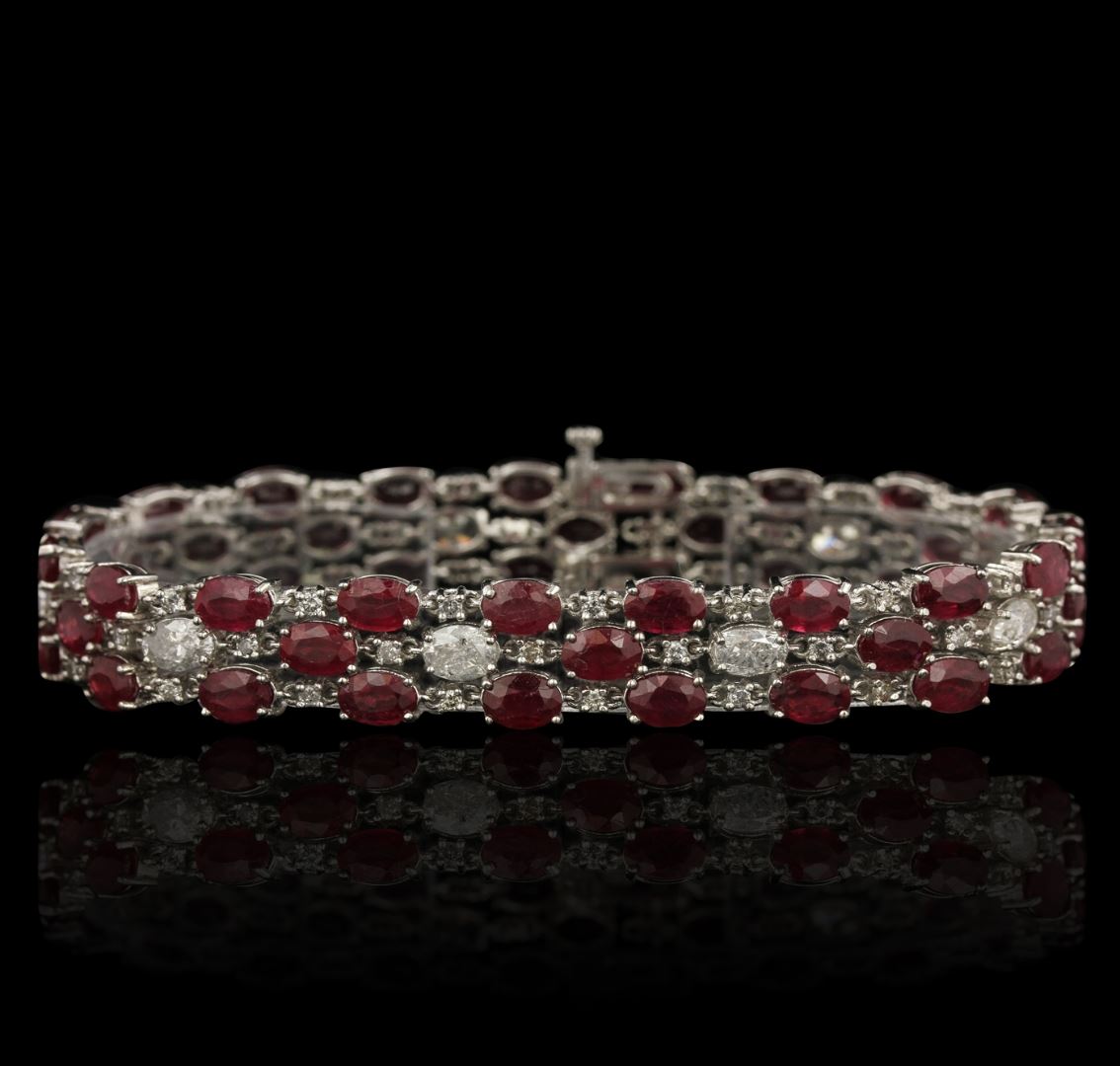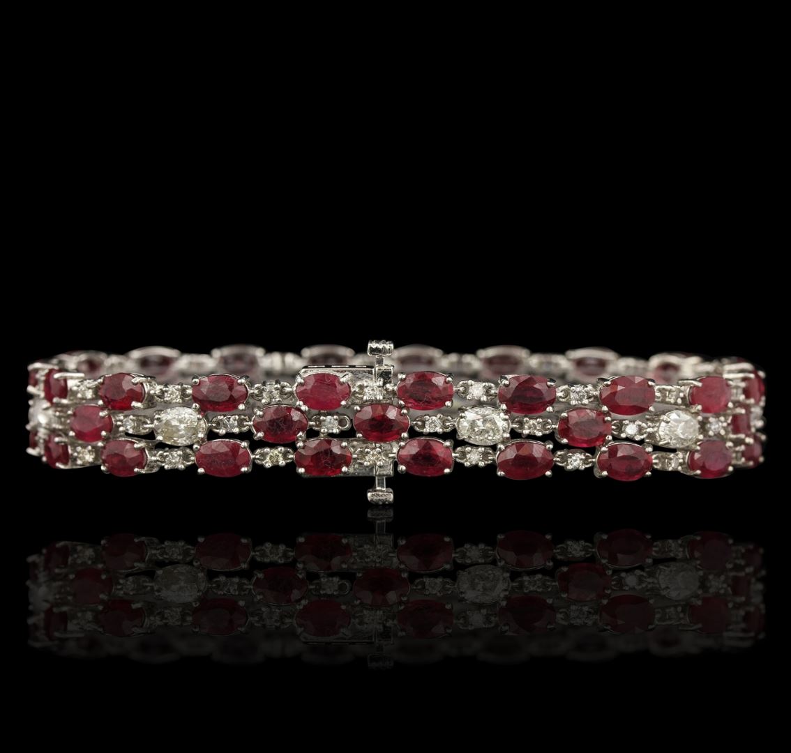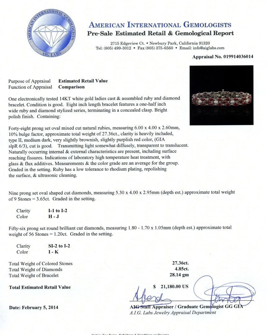 One electronically tested 14KT White Gold ladies cast & assembled ruby and diamond bracelet. Condition is Good. Eight inch length bracelet features a one-half inch wide ruby and diamond stylized series, terminating in a concealed clasp. Bright polish finish. Containing: Forty-eight prong set oval mixed cut natural rubies, measuring 6.00 x 4.00 x 2.60mm, 10%. bulge factor, approximate total weight of 27.36ct., clarity is heavily included, type II, medium dark, very slightly brownish, slightly purplish red color, (GIA slpR 6/3), cut is Good. Transmitting light somewhat diffusely, transparent to translucent. Naturally occurring internal & external characteristics are present, including surface reaching fissures. Indications of laboratory high temperature heat treatment, with glass & flux additives. Measurements & the color grade are an average for the group. Graded in the setting. Ruby has a low tolerance to rhodium plating, repolishing the surface, & ultrasonic cleaning. Nine prong set oval shaped cut diamonds, measuring 5.30 x 4.00 x 2.95mm (depth est.) approximate total weight of 9 Stones = 3.65ct. Graded in the setting. Clarity: I-1 to I-2. Color: H - J Fifty-Six prong set round brilliant cut diamonds, measuring 1.80 - 1.70 x 1.05mm (depth est.) approximate total weight of 56 Stones = 1.20ct. Graded in the setting. Clarity: SI-2 to I-2. Color: I - K. Total Weight of Colored Stones 27.36ct. Total Weight of Diamonds 4.85ct. Total Weight of Bracelet 28.14 grams. AIG Appraised at $21,180.00.