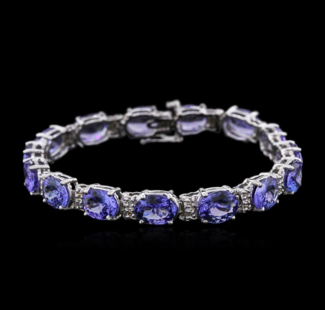 One electronically tested 14KT white gold ladies cast tanzanite and diamond bracelet with a hidden box clasp with safety closer with a bright polish finish. Measurements: 6.75" in length Identified with markings of "14K". Condition is new. Containing: Fifteen prong set oval modified brilliant cut natural tanzanites, measuring 8.80 x 6.80 x 4.42mm, approximate total weight of 27.90ct., clarity is eye clean, type I, medium light, very slightly grayish, violet color, (GIA V 4/3), cut is good. Thirty prong set round brilliant cut diamonds, measuring 1.30 - 1.30 x 0.78mm (depth est.) approximate total weight of 30 Stones = 0.24ct. Clarity: SI-2 to I-1. Color: I - K, Cut is Good. All diamonds and colored gemstones are graded in the mounting, unless otherwise stated. Colored gemstones are presumed to have been subjected to commonly used enhancement processes. Total Weight of Colored Stones 27.90ct. Total Weight of Diamonds 0.24ct. Total Weight of Bracelet 19.10 grams. GGL Appraised at $12,950.00.