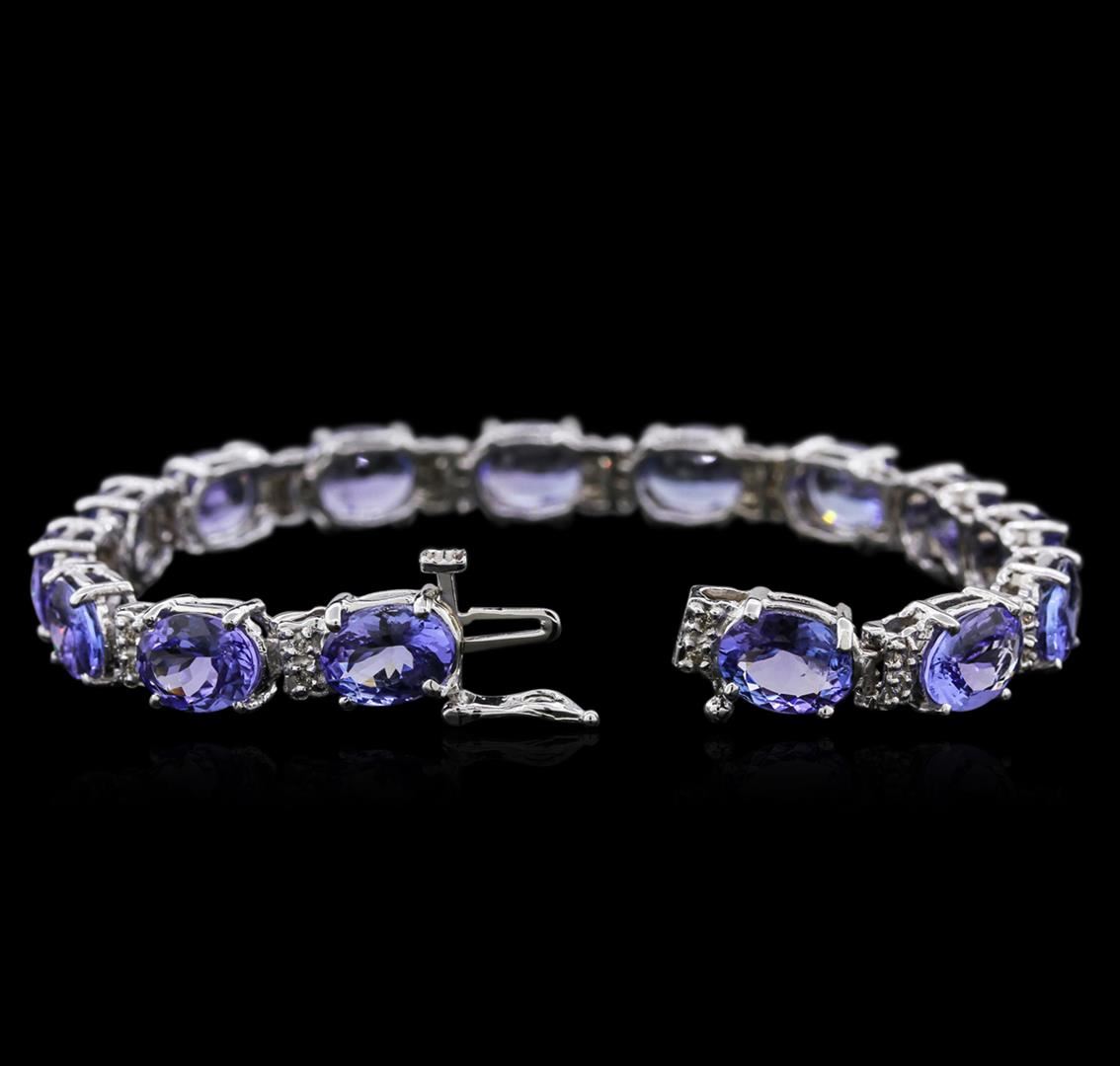 One electronically tested 14KT white gold ladies cast tanzanite and diamond bracelet with a hidden box clasp with safety closer with a bright polish finish. Measurements: 6.75" in length Identified with markings of "14K". Condition is new. Containing: Fifteen prong set oval modified brilliant cut natural tanzanites, measuring 8.80 x 6.80 x 4.42mm, approximate total weight of 27.90ct., clarity is eye clean, type I, medium light, very slightly grayish, violet color, (GIA V 4/3), cut is good. Thirty prong set round brilliant cut diamonds, measuring 1.30 - 1.30 x 0.78mm (depth est.) approximate total weight of 30 Stones = 0.24ct. Clarity: SI-2 to I-1. Color: I - K, Cut is Good. All diamonds and colored gemstones are graded in the mounting, unless otherwise stated. Colored gemstones are presumed to have been subjected to commonly used enhancement processes. Total Weight of Colored Stones 27.90ct. Total Weight of Diamonds 0.24ct. Total Weight of Bracelet 19.10 grams. GGL Appraised at $12,950.00.