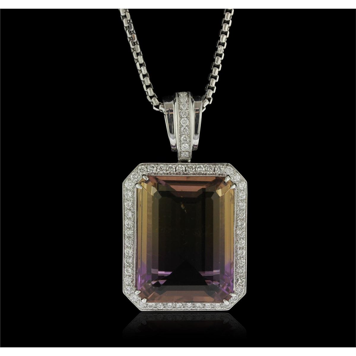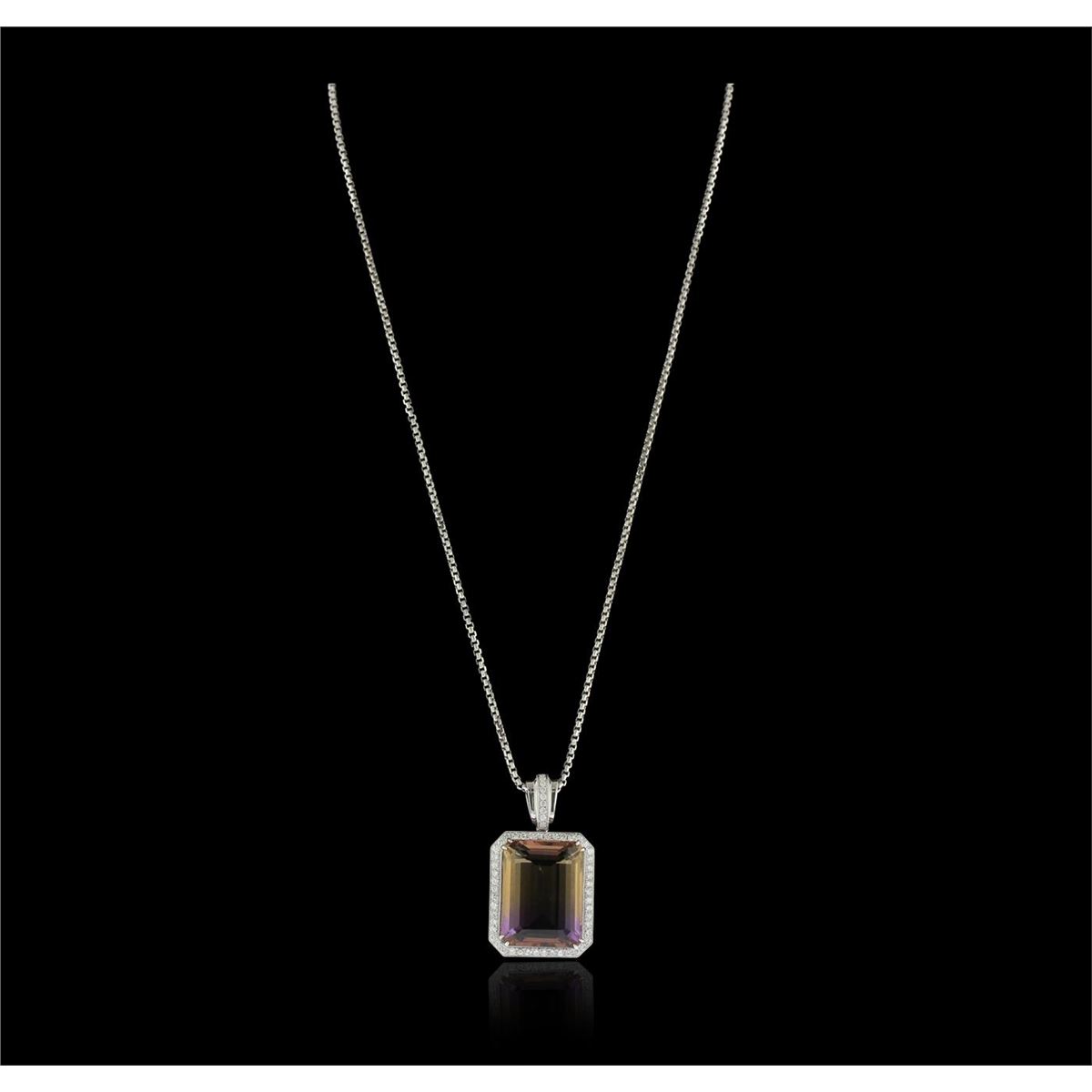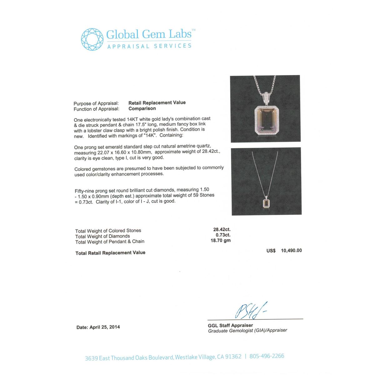 One electronically tested 14KT white gold Ladies combination cast & die struck pendant & chain 17.5" long, medium fancy box link with a lobster claw clasp with a bright polish finish. Condition is new. Identified with markings of "14K". Containing: One prong set emerald standard step cut natural ametrine quartz, measuring 22.07 x 16.60 x 10.80mm, approximate weight of 28.42ct., clarity is eye clean, type I, cut is very good. Colored gemstones are presumed to have been subjected to commonly used color/clarity enhancement processes. Fifty-Nine prong set round brilliant cut diamonds, measuring 1.50 - 1.50 x 0.90mm (depth est.) approximate. Total Weight of 59 Stones = 0.73ct. Clarity: I-1. Color: I - J, Cut is Good. Total Weight of Colored Stones 28.42ct. Total Weight of Diamonds 0.73ct. Total Weight of Pendant & Chain 18.70 grams. GGL Appraised at $10,490.00.