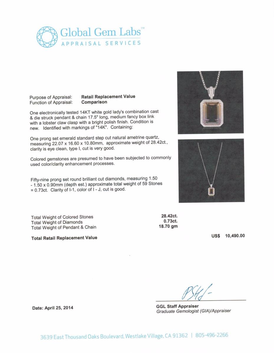 One electronically tested 14KT white gold Ladies combination cast & die struck pendant & chain 17.5" long, medium fancy box link with a lobster claw clasp with a bright polish finish. Condition is new. Identified with markings of "14K". Containing: One prong set emerald standard step cut natural ametrine quartz, measuring 22.07 x 16.60 x 10.80mm, approximate weight of 28.42ct., clarity is eye clean, type I, cut is very good. Colored gemstones are presumed to have been subjected to commonly used color/clarity enhancement processes. Fifty-Nine prong set round brilliant cut diamonds, measuring 1.50 - 1.50 x 0.90mm (depth est.) approximate. Total Weight of 59 Stones = 0.73ct. Clarity: I-1. Color: I - J, Cut is Good. Total Weight of Colored Stones 28.42ct. Total Weight of Diamonds 0.73ct. Total Weight of Pendant & Chain 18.70 grams. GGL Appraised at $10,490.00.