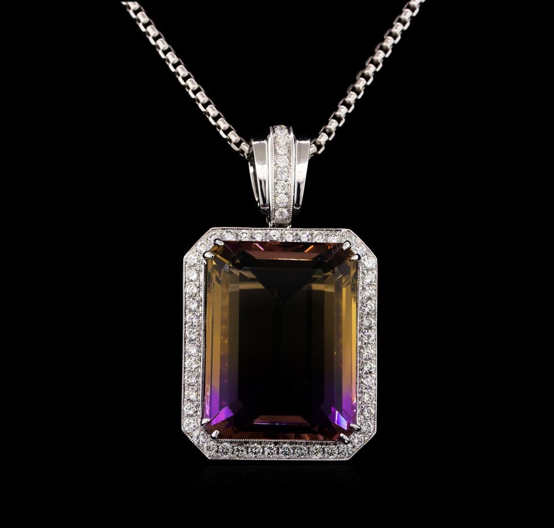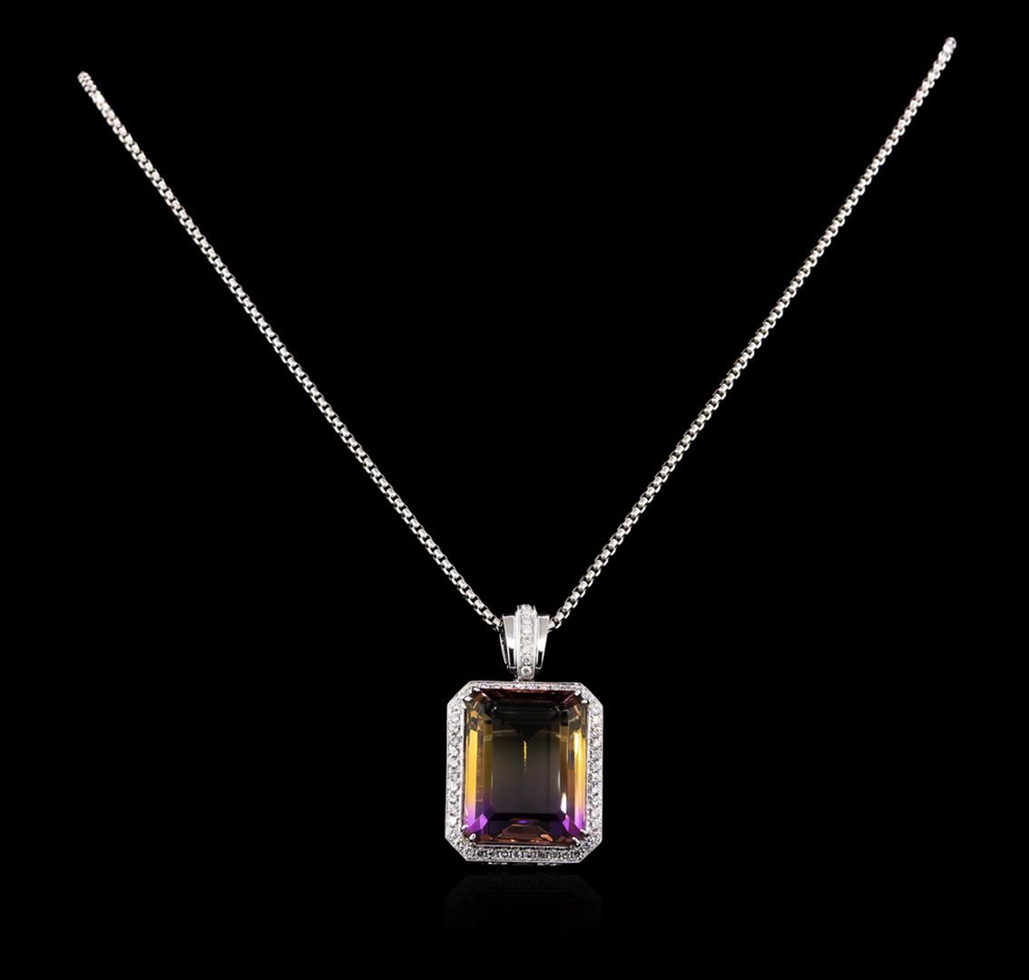 One electronically tested 14KT white gold Ladies combination cast & die struck pendant & chain 17.5" long, medium fancy box link with a lobster claw clasp with a bright polish finish. Condition is new. Identified with markings of "14K". Containing: One prong set emerald standard step cut natural ametrine quartz, measuring 22.07 x 16.60 x 10.80mm, approximate weight of 28.42ct., clarity is eye clean, type I, cut is very good. Colored gemstones are presumed to have been subjected to commonly used color/clarity enhancement processes. Fifty-Nine prong set round brilliant cut diamonds, measuring 1.50 - 1.50 x 0.90mm (depth est.) approximate. Total Weight of 59 Stones = 0.73ct. Clarity: I-1. Color: I - J, Cut is Good. Total Weight of Colored Stones 28.42ct. Total Weight of Diamonds 0.73ct. Total Weight of Pendant & Chain 18.70 grams. GGL Appraised at $10,490.00.